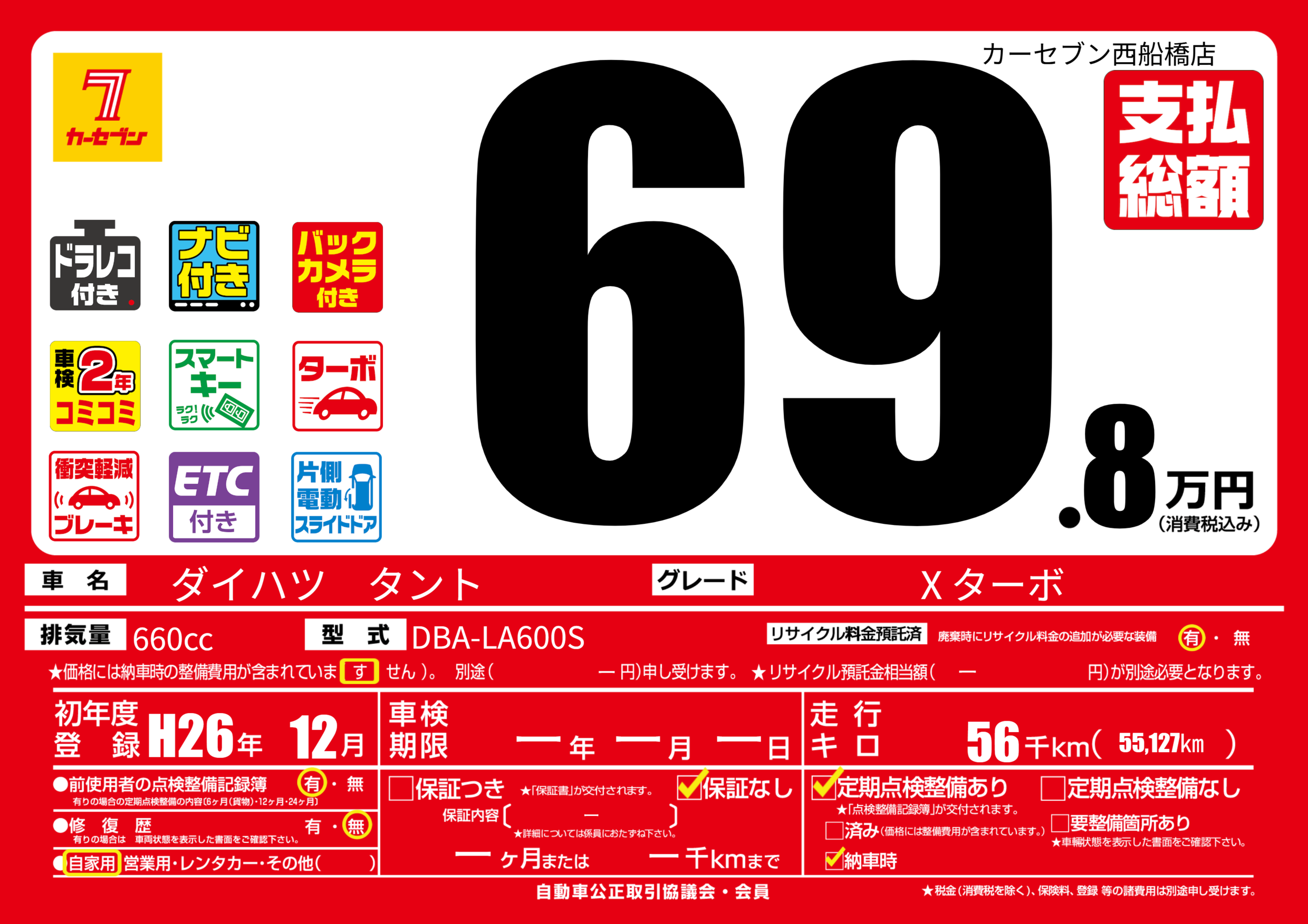 | 車名 | ダイハツ タント | グレード ミッション 排気量 |