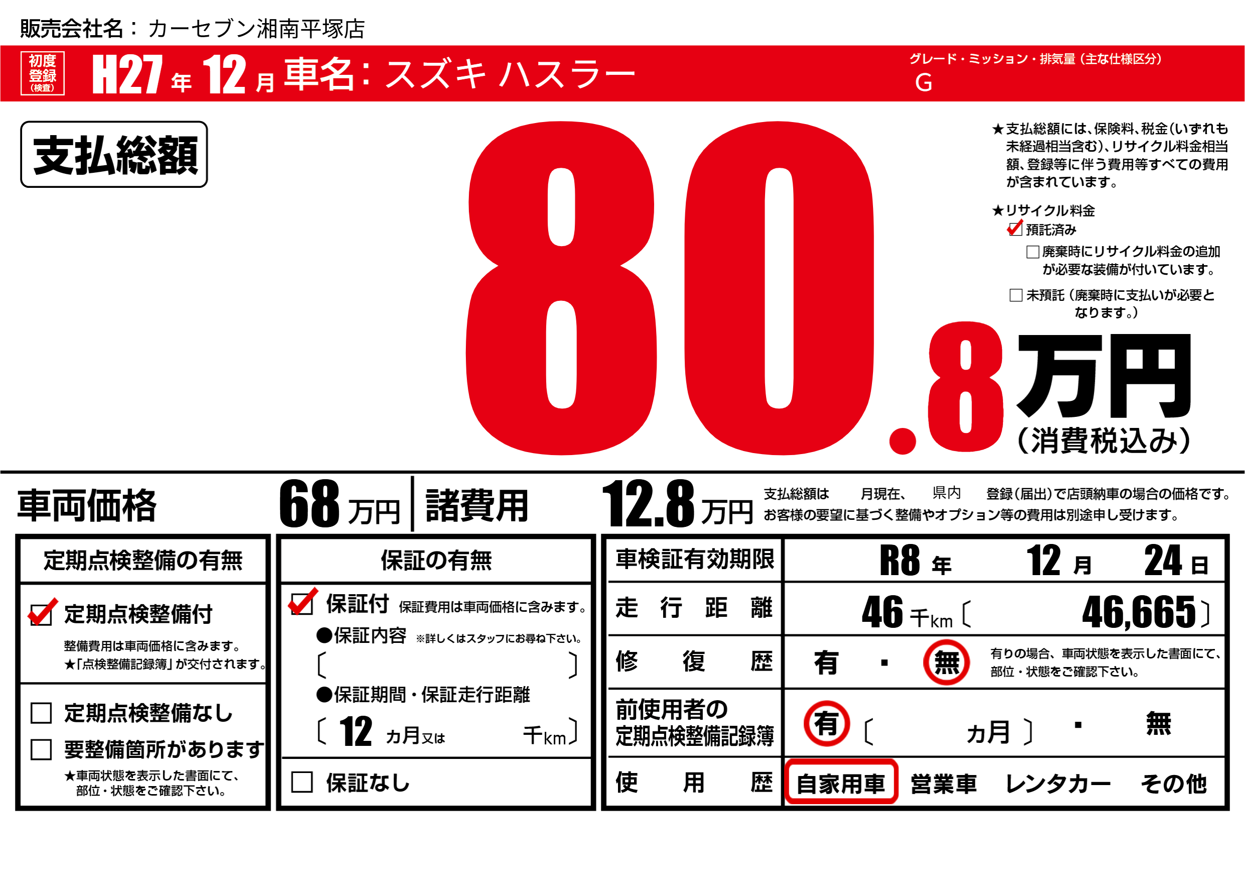 | 走行キロ | 4.6万km | 初年度登録 | H27年12月 |