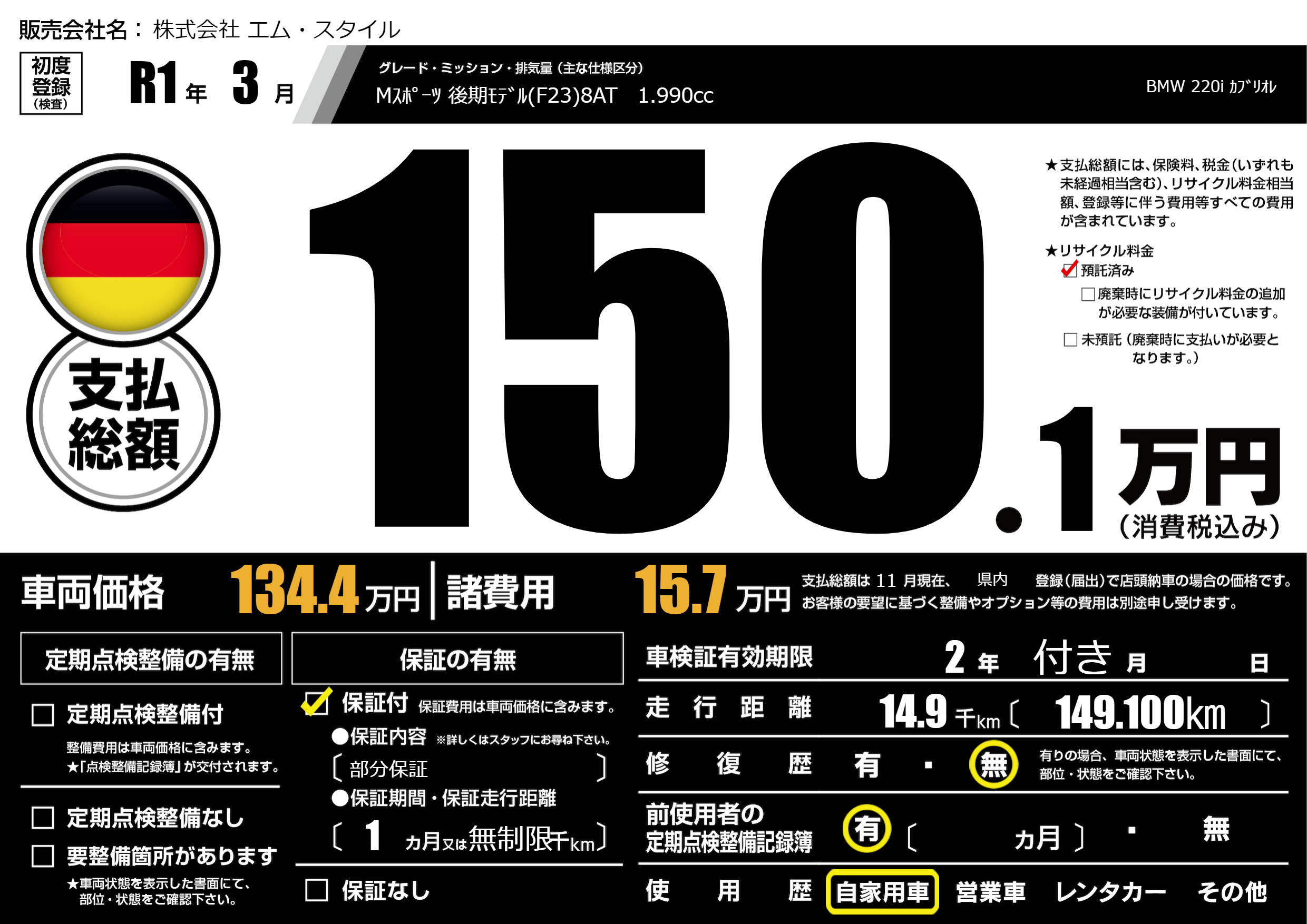 | 車名 | BMW 220i カブリオレ | グレード ミッション 排気量 |