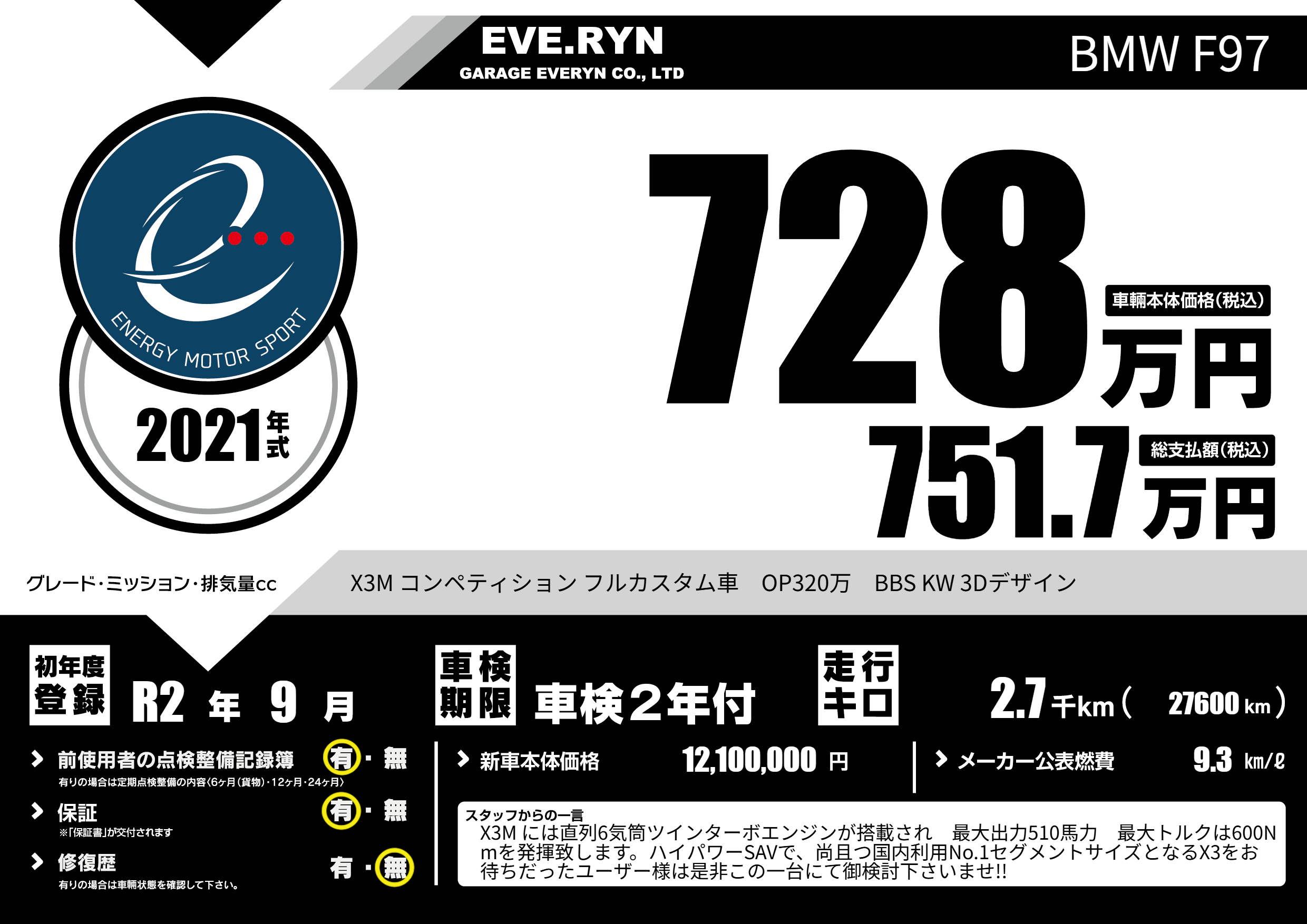 X3M コンペティション フルカスタム車 OP320万 BBS KW 3Dデザイン |