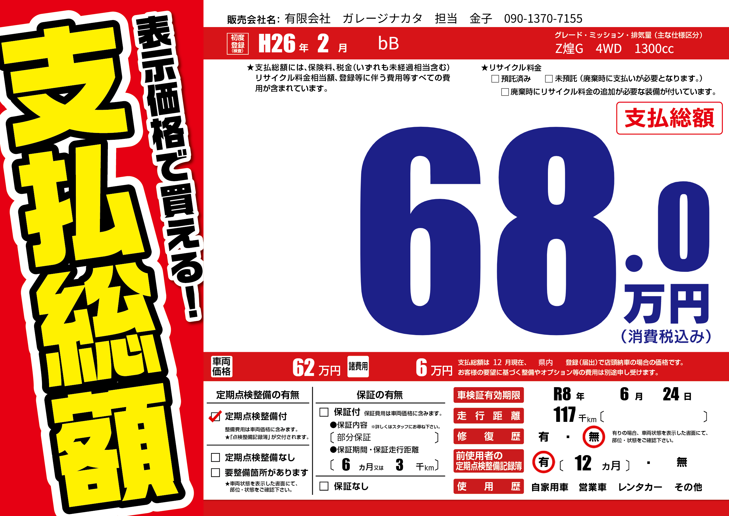 | 走行キロ | 11.7万km | 初年度登録 | H26年2月 |