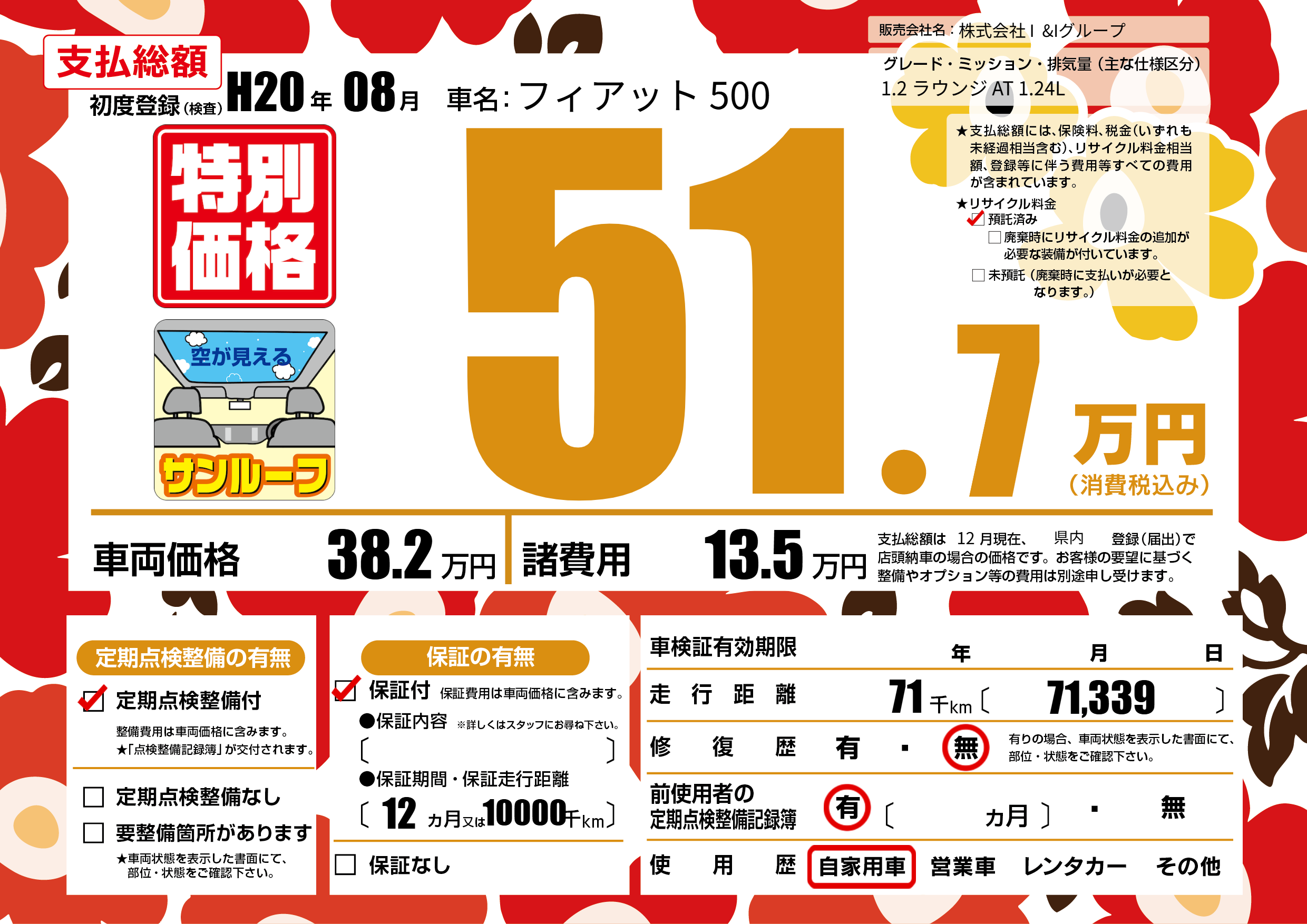 | 車名 | フィアット 500 | グレード ミッション 排気量 |