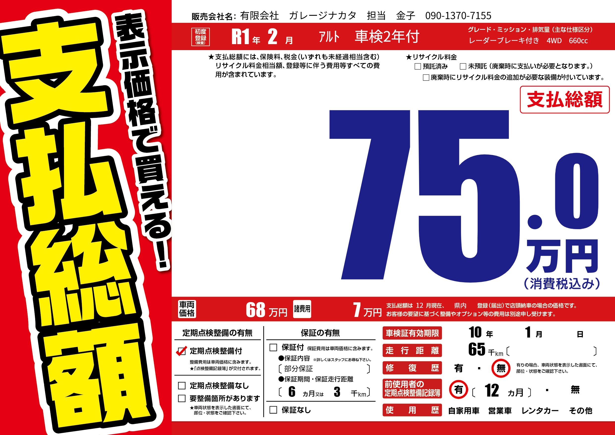 | 車名 | アルト 車検2年付 | グレード ミッション 排気量 |