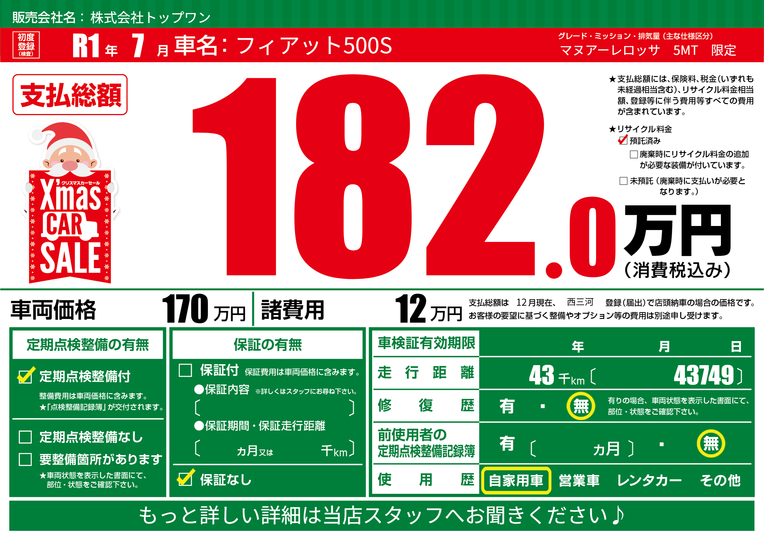 | 車名 | フィアット500S | グレード ミッション 排気量 |