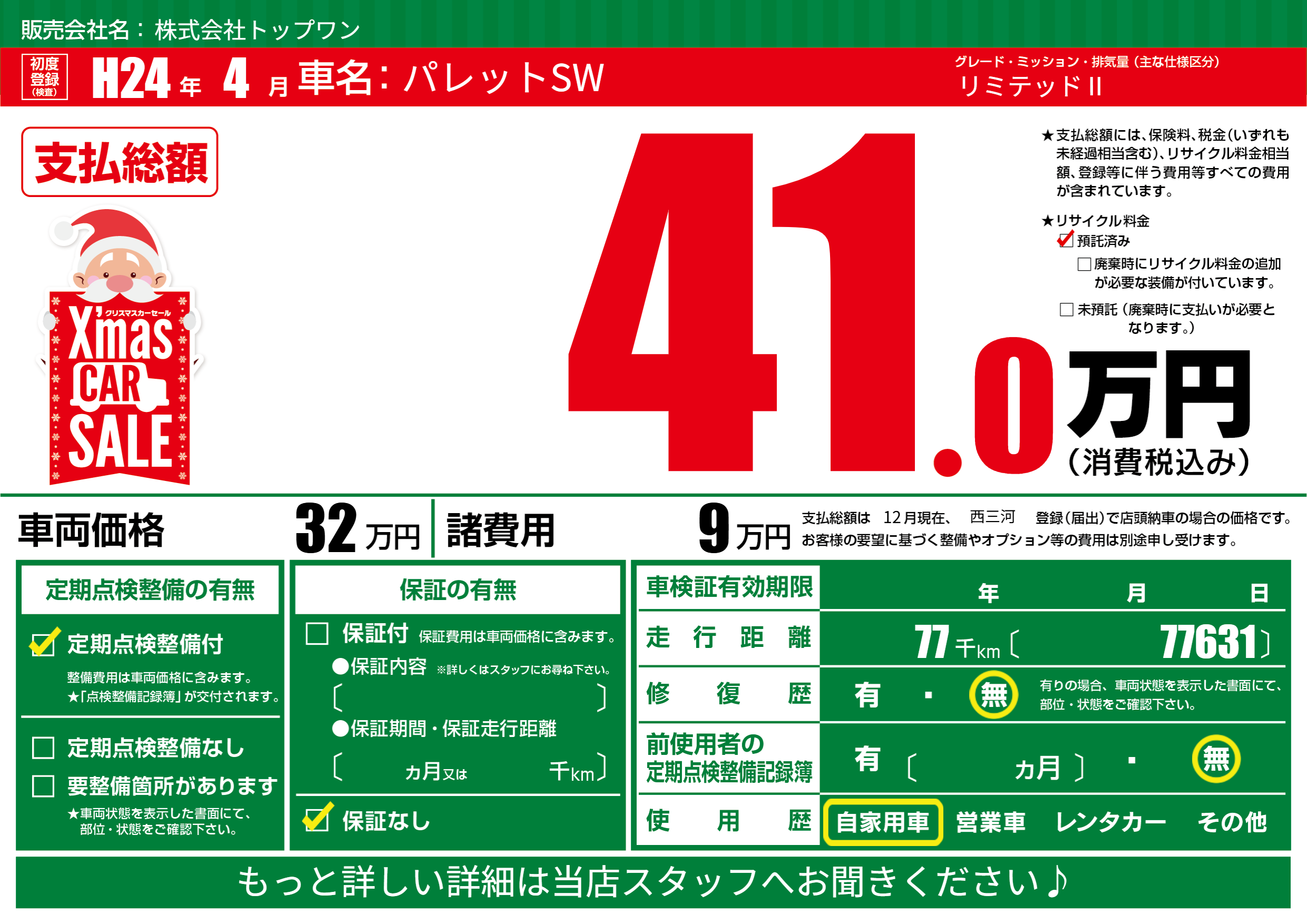 | 車名 | パレットSW | グレード ミッション 排気量 |