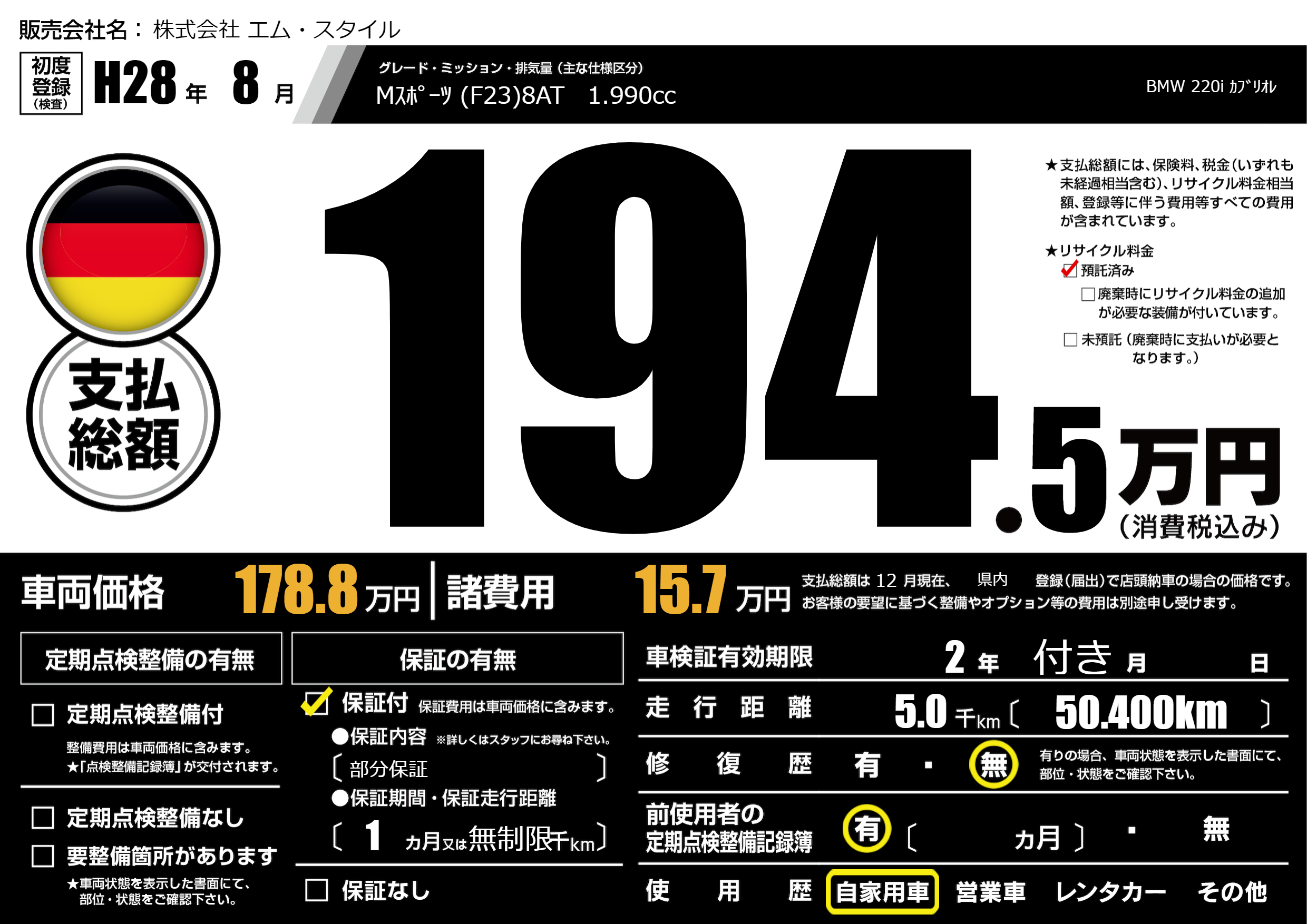 | 車名 | BMW 220i カブリオレ | グレード ミッション 排気量 |