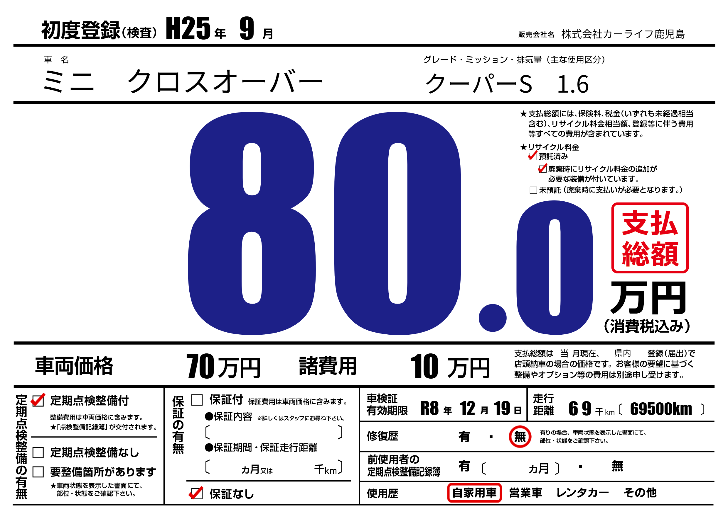 | 走行キロ | 0.6万km | 初年度登録 | H25年9月 |