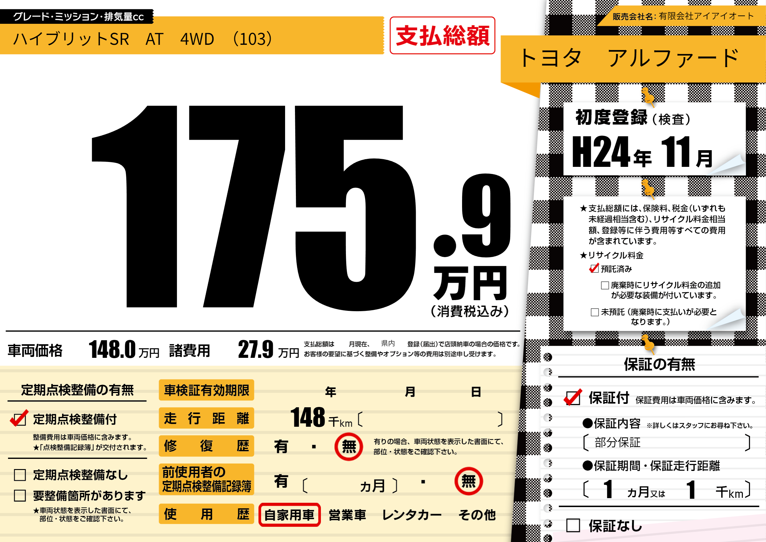| 走行キロ | 14.8万km | 初年度登録 | H24年11月 |