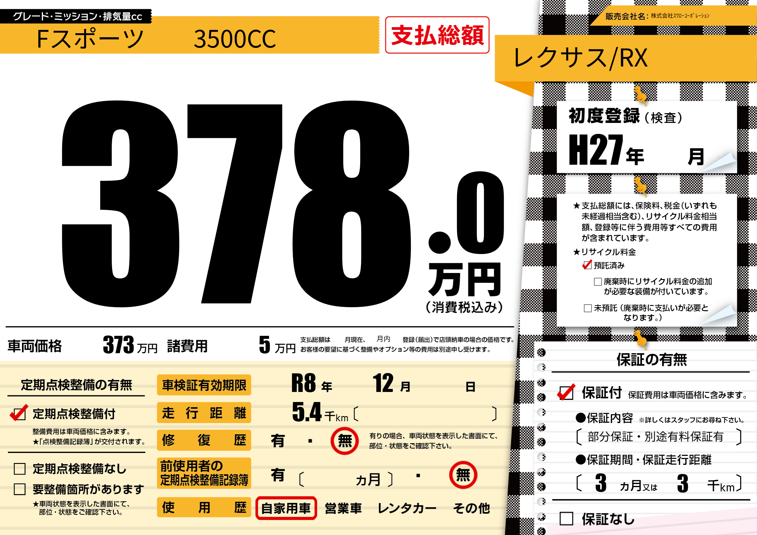 | 車名 | レクサス/RX | グレード ミッション 排気量 |
