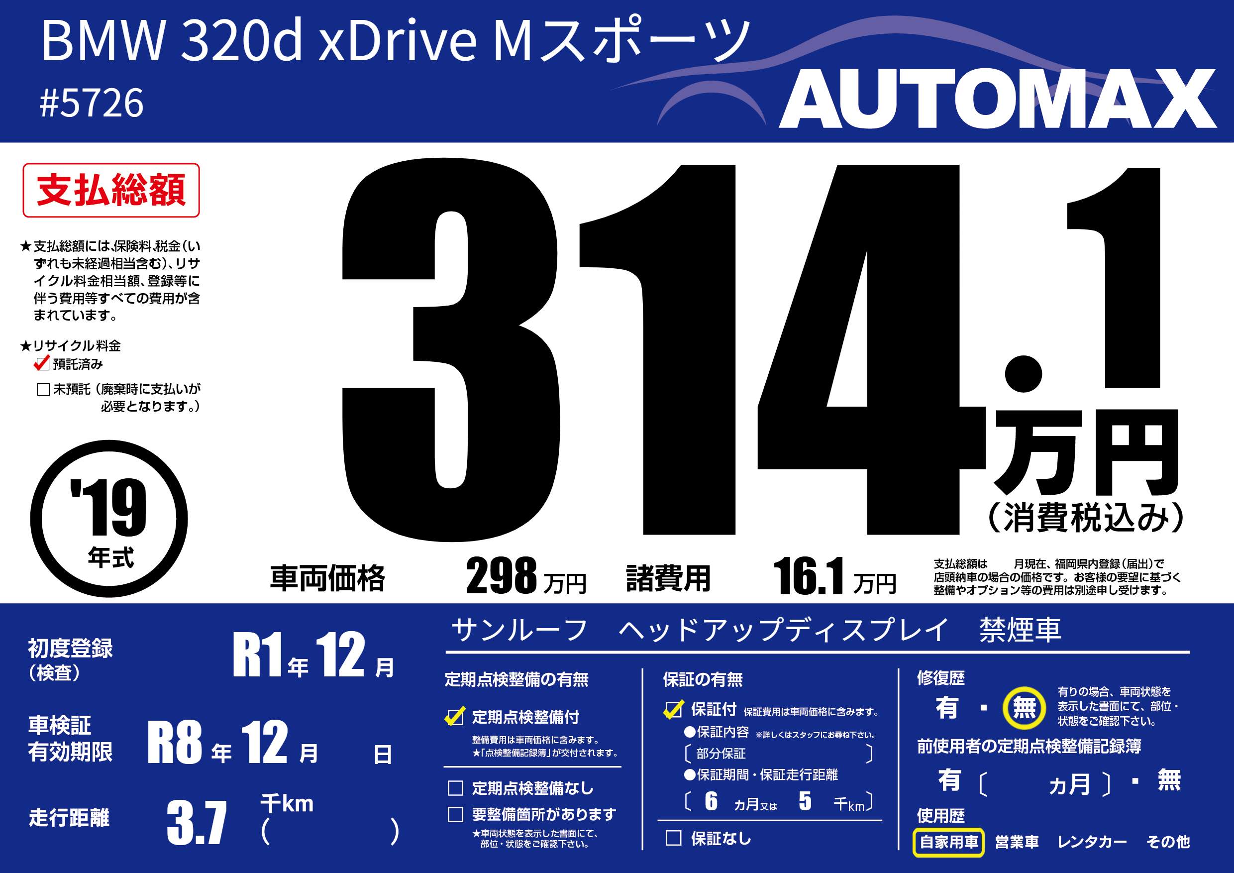 | 車名 | BMW 320d xDrive Mスポーツ | グレード ミッション 排気量 |
