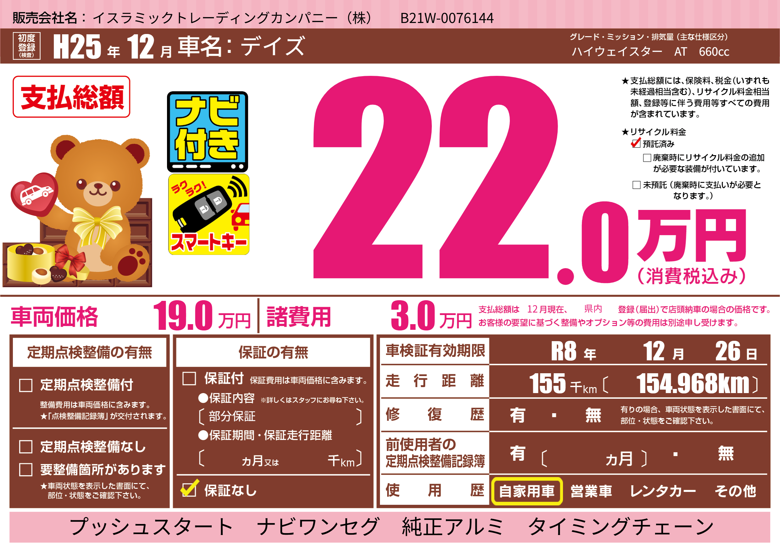 | 走行キロ | 15.5万km | 初年度登録 | H25年12月 |