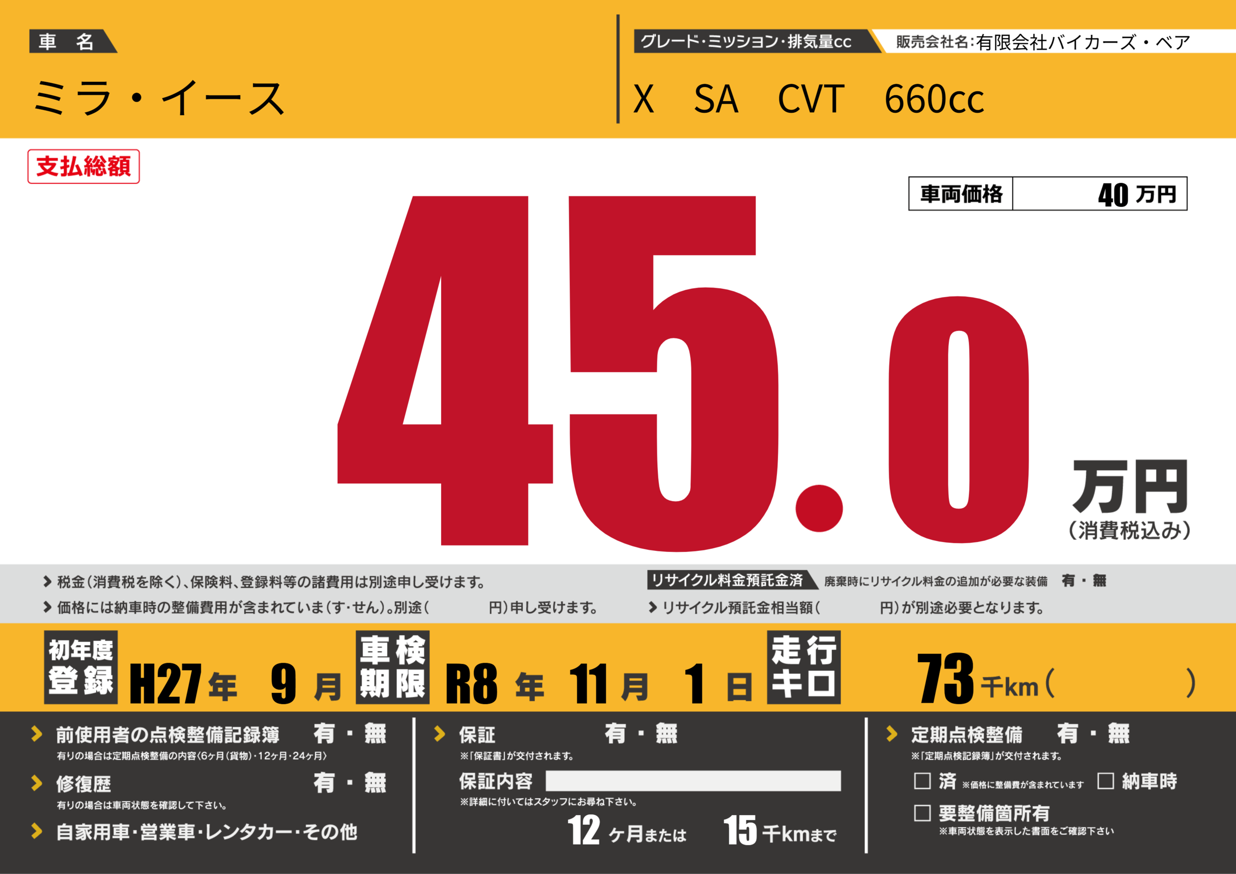 | 走行キロ | 7.3万km | 初年度登録 | H27年9月 |