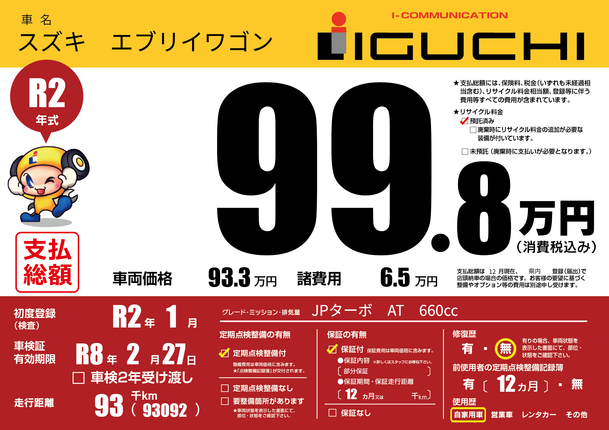 | 車名 | スズキ エブリイワゴン | グレード ミッション 排気量 |