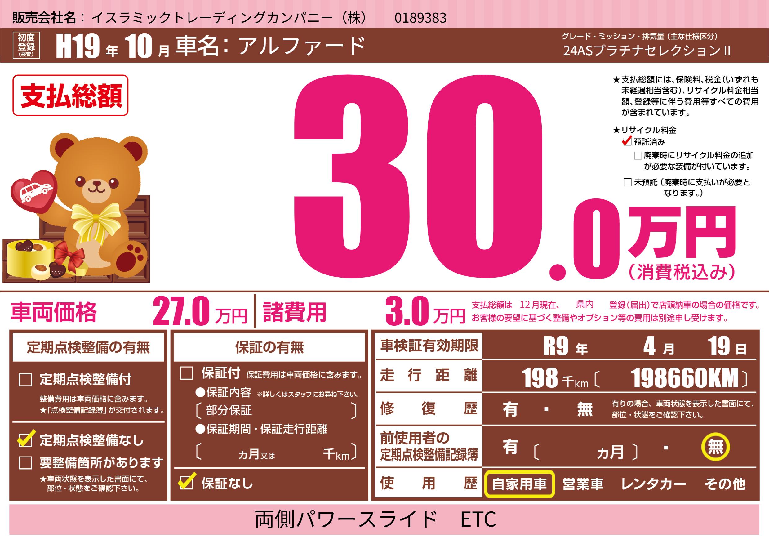 | 車名 | アルファード | グレード ミッション 排気量 |