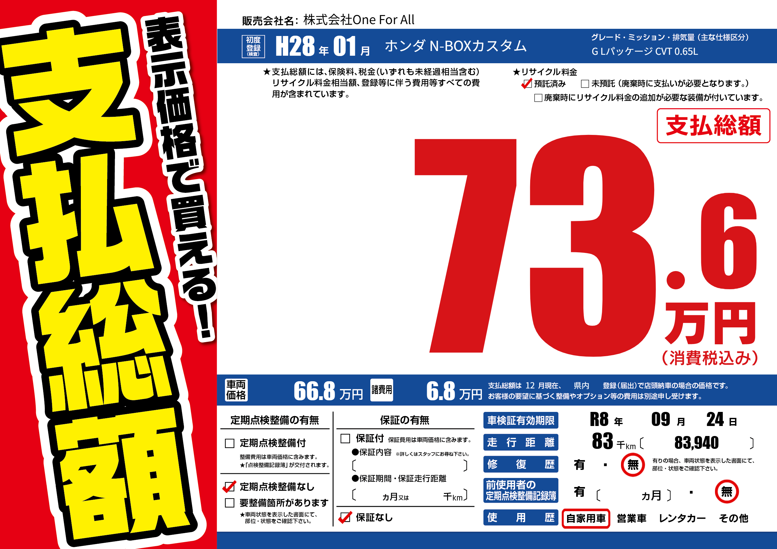 | 走行キロ | 8.3万km | 初年度登録 | H28年01月 |