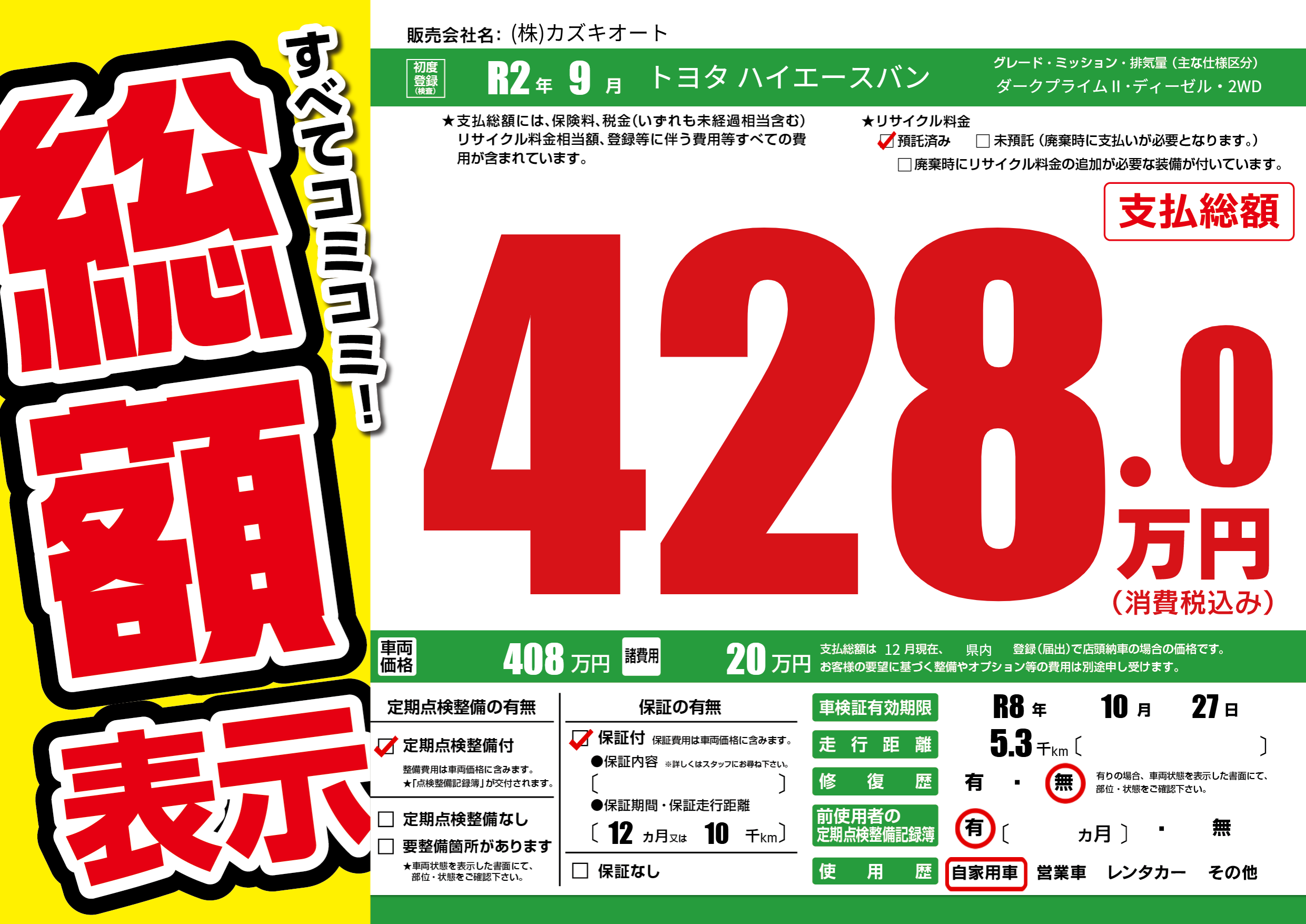 | 車名 | トヨタ ハイエースバン | グレード ミッション 排気量 |