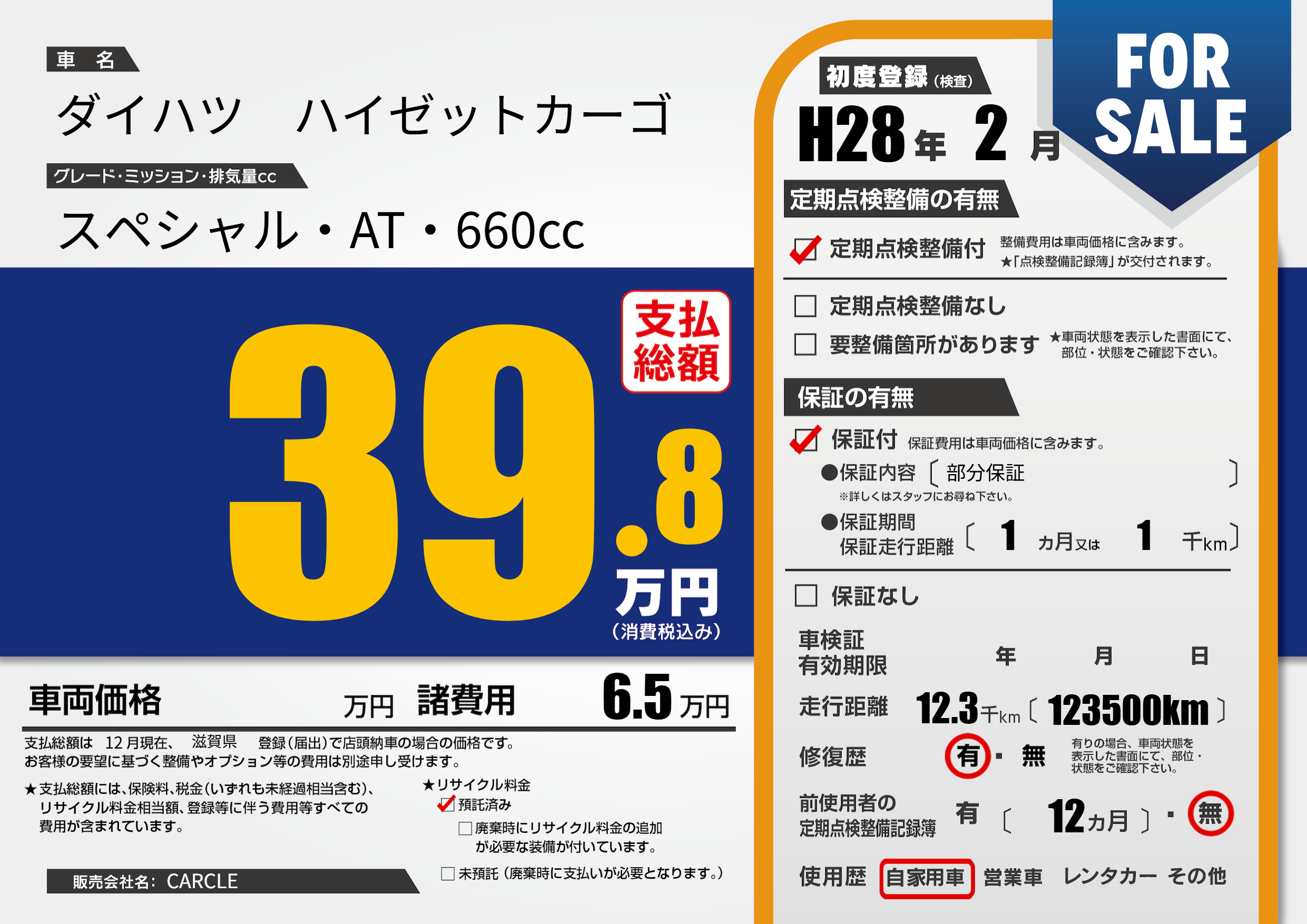 | 車名 | ダイハツ ハイゼットカーゴ | グレード ミッション 排気量 |