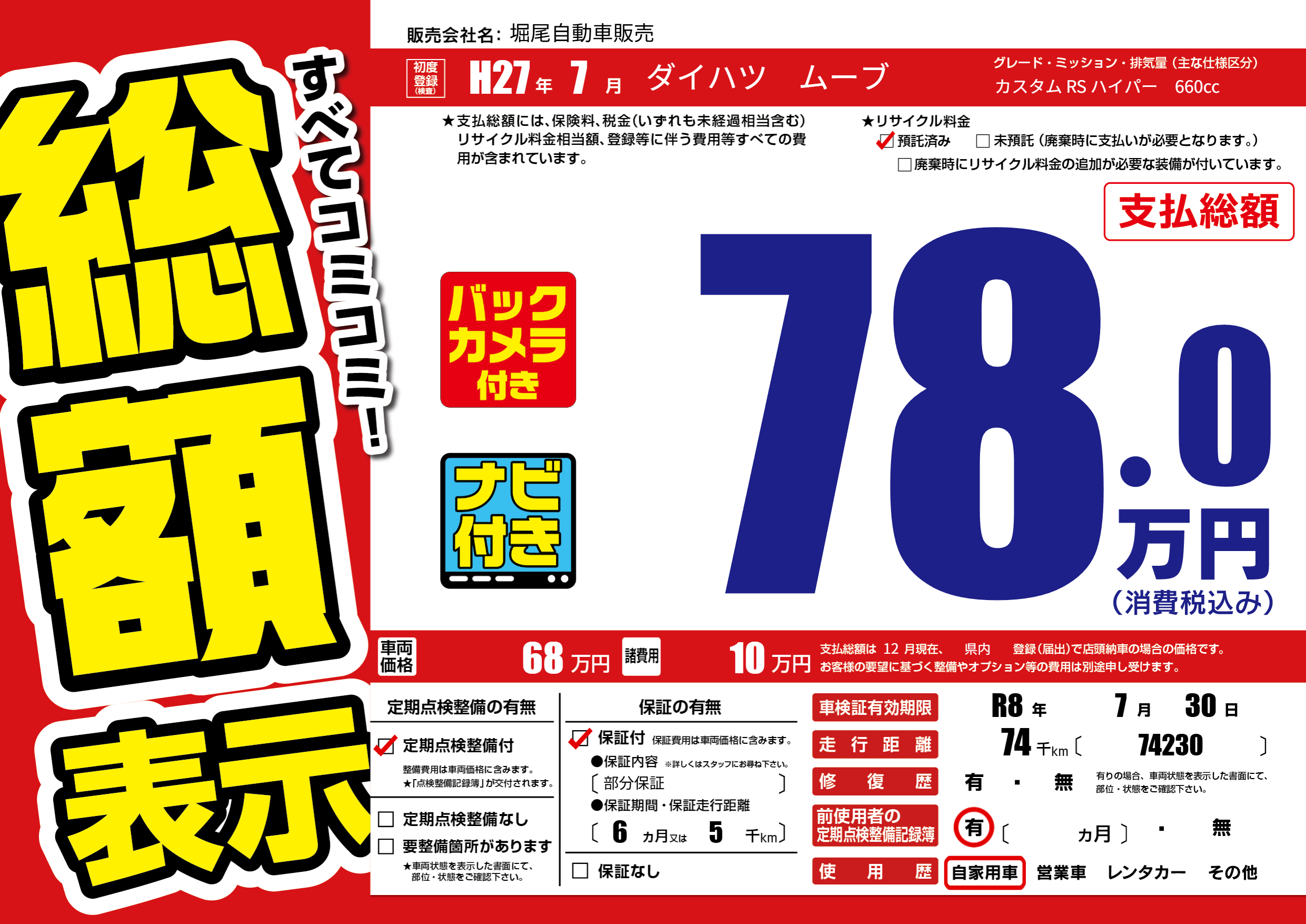 | 走行キロ | 7.4万km | 初年度登録 | H27年7月 |
