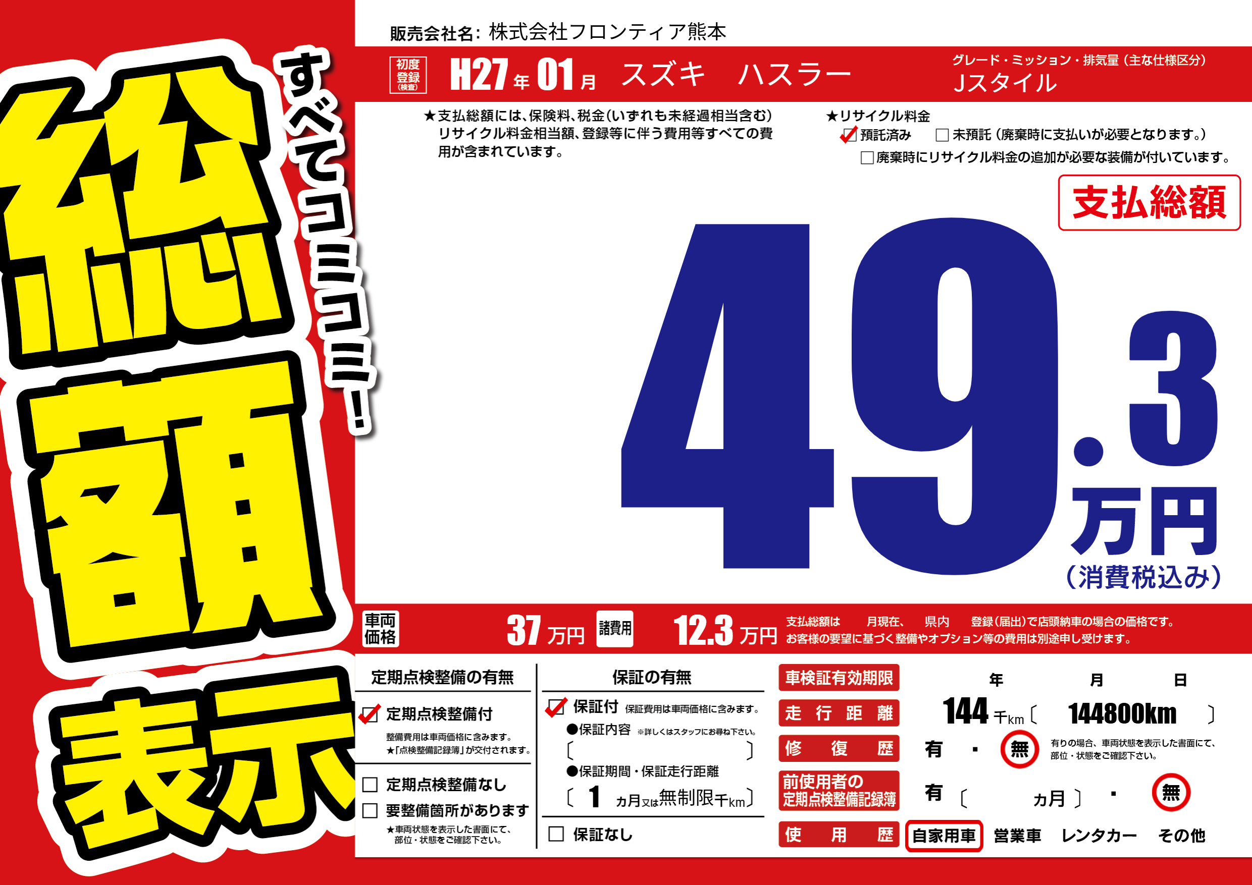 | 車名 | スズキ ハスラー | グレード ミッション 排気量 |