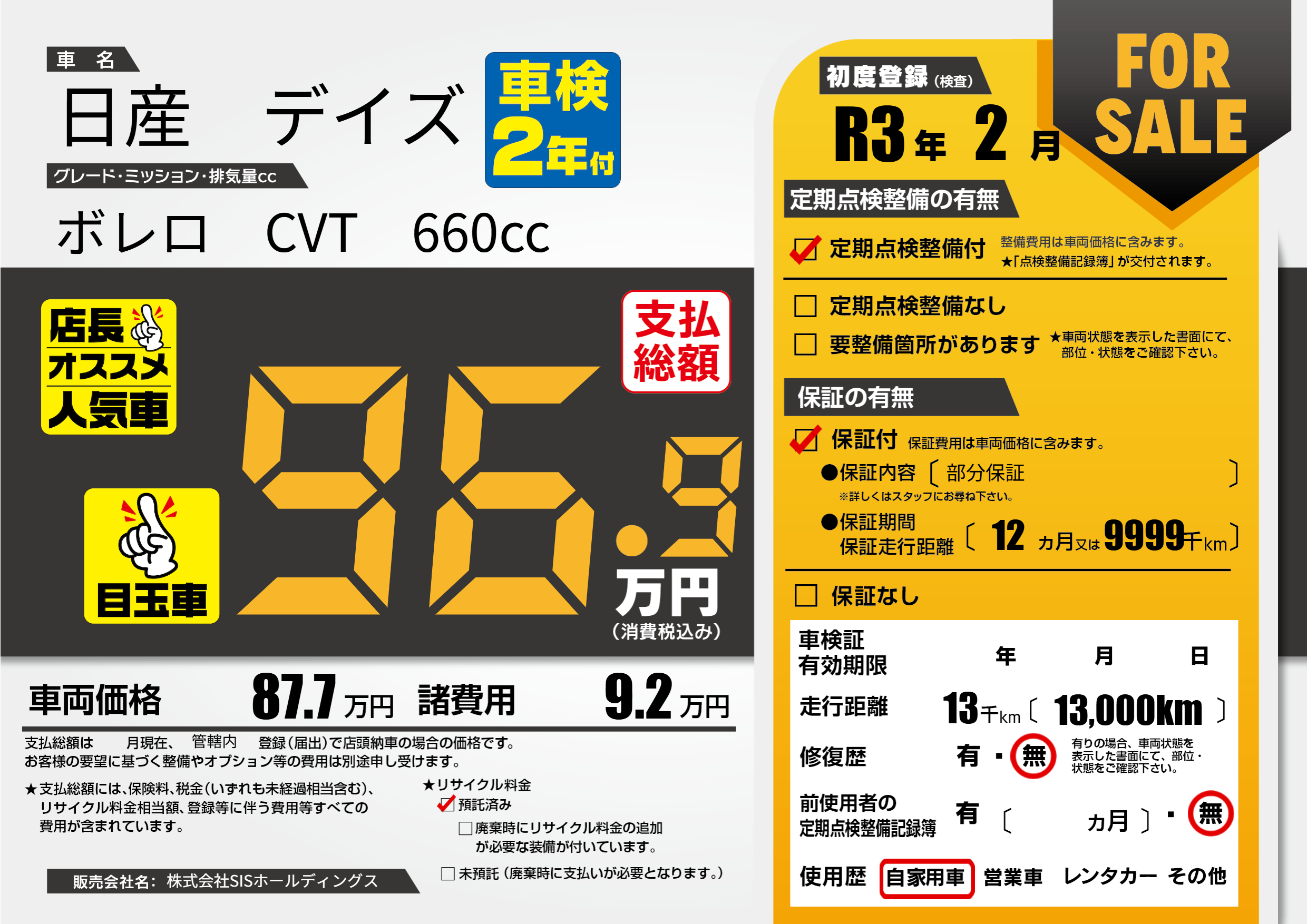 | 車名 | 日産 デイズ | グレード ミッション 排気量 |