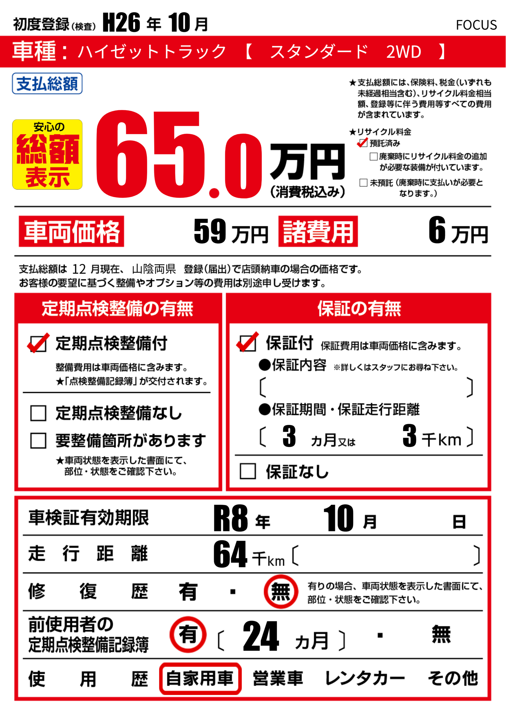 | 走行キロ | 6.4万km | 初年度登録 | H26年10月 |