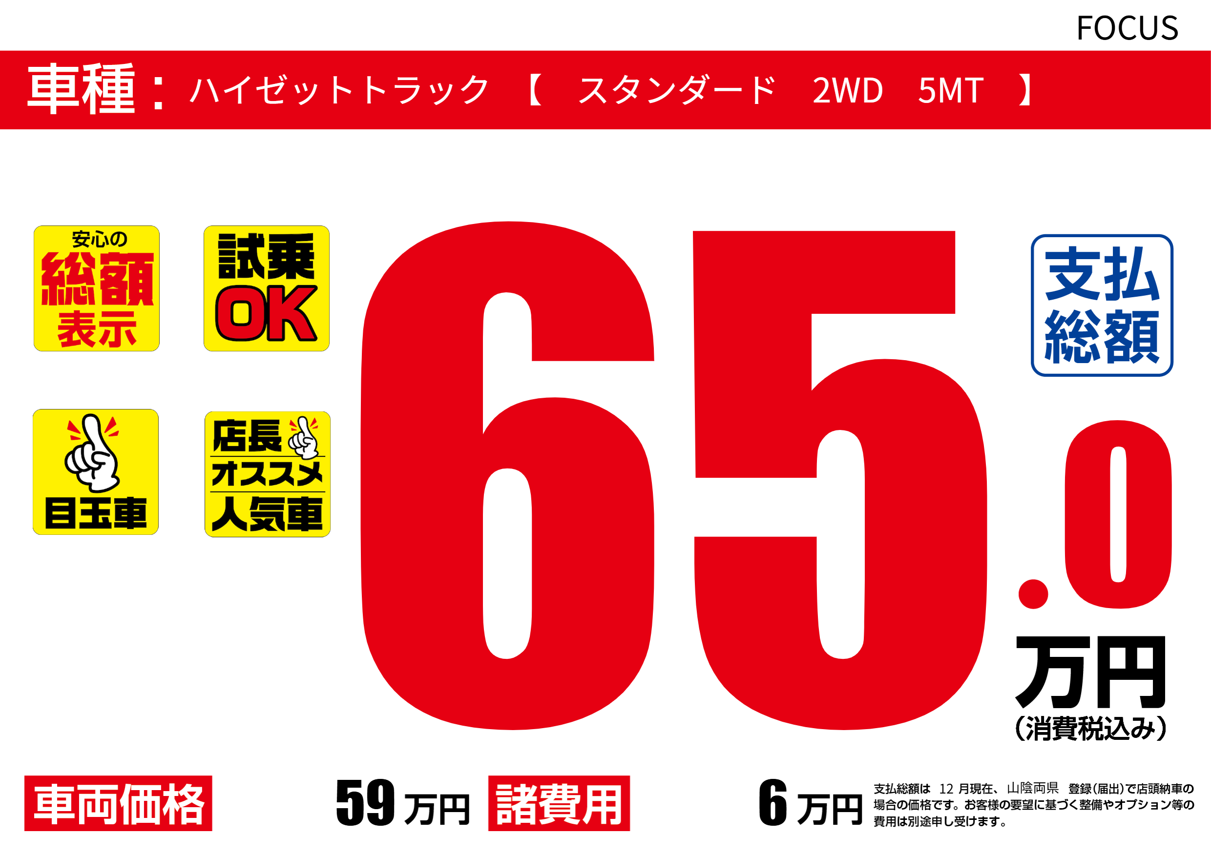 | 車名 | ハイゼットトラック 【 スタンダード 2WD 5MT 】 | グレード ミッション 排気量 |