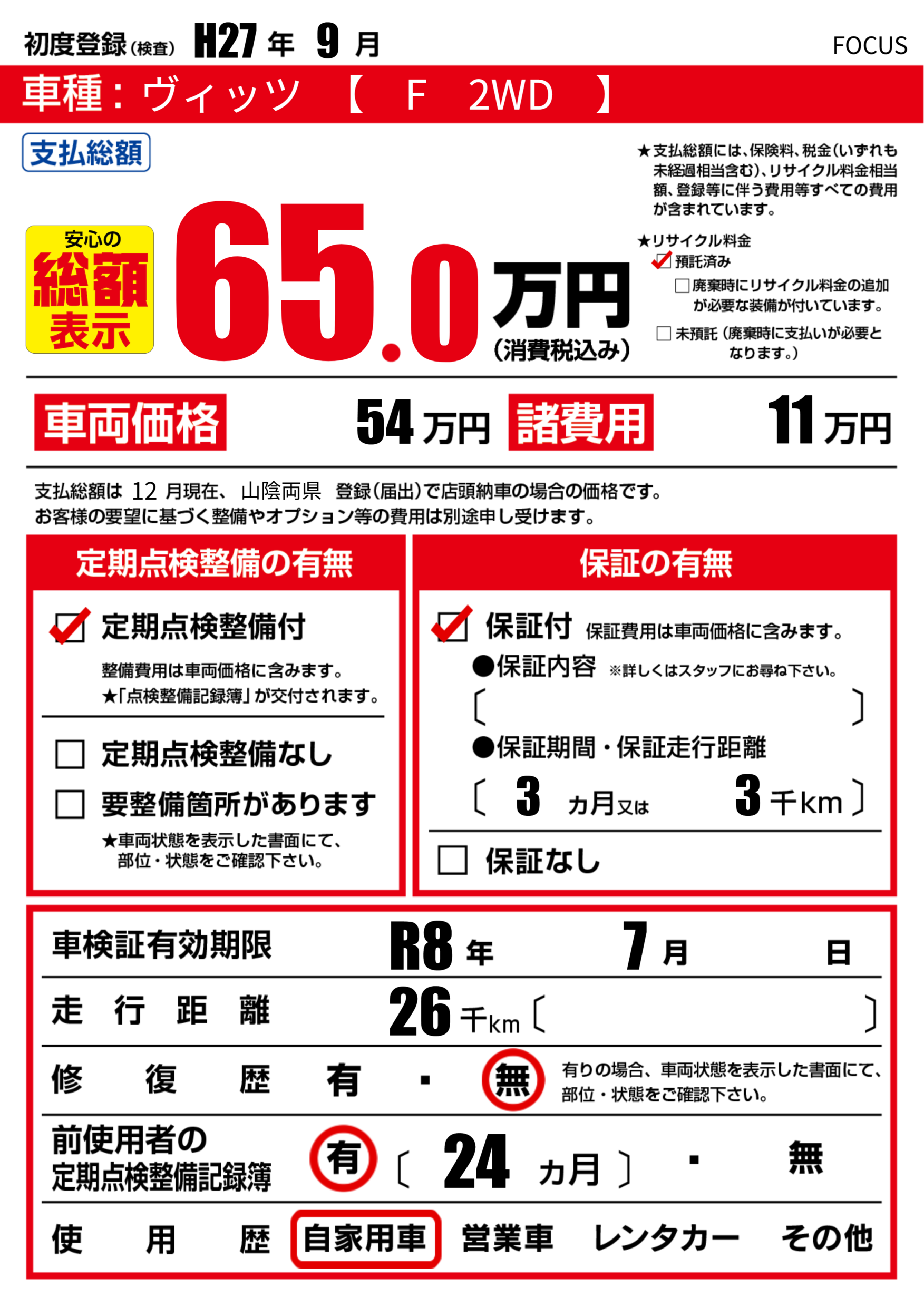 | 走行キロ | 2.6万km | 初年度登録 | H27年9月 |