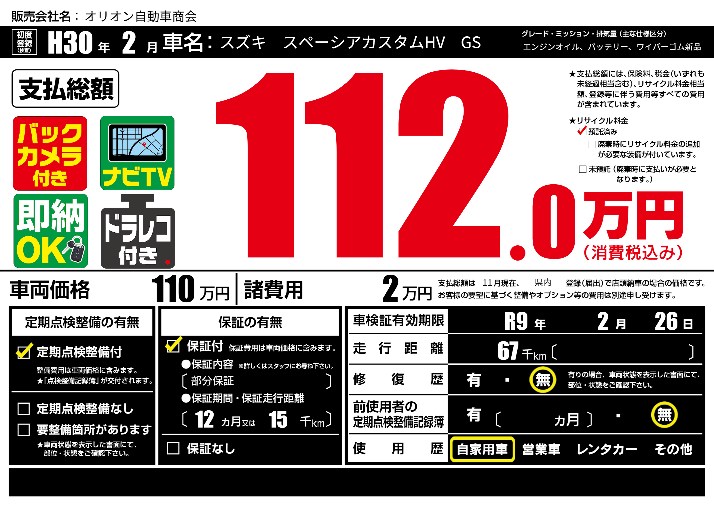 | 走行キロ | 6.7万km | 初年度登録 | H30年2月 |