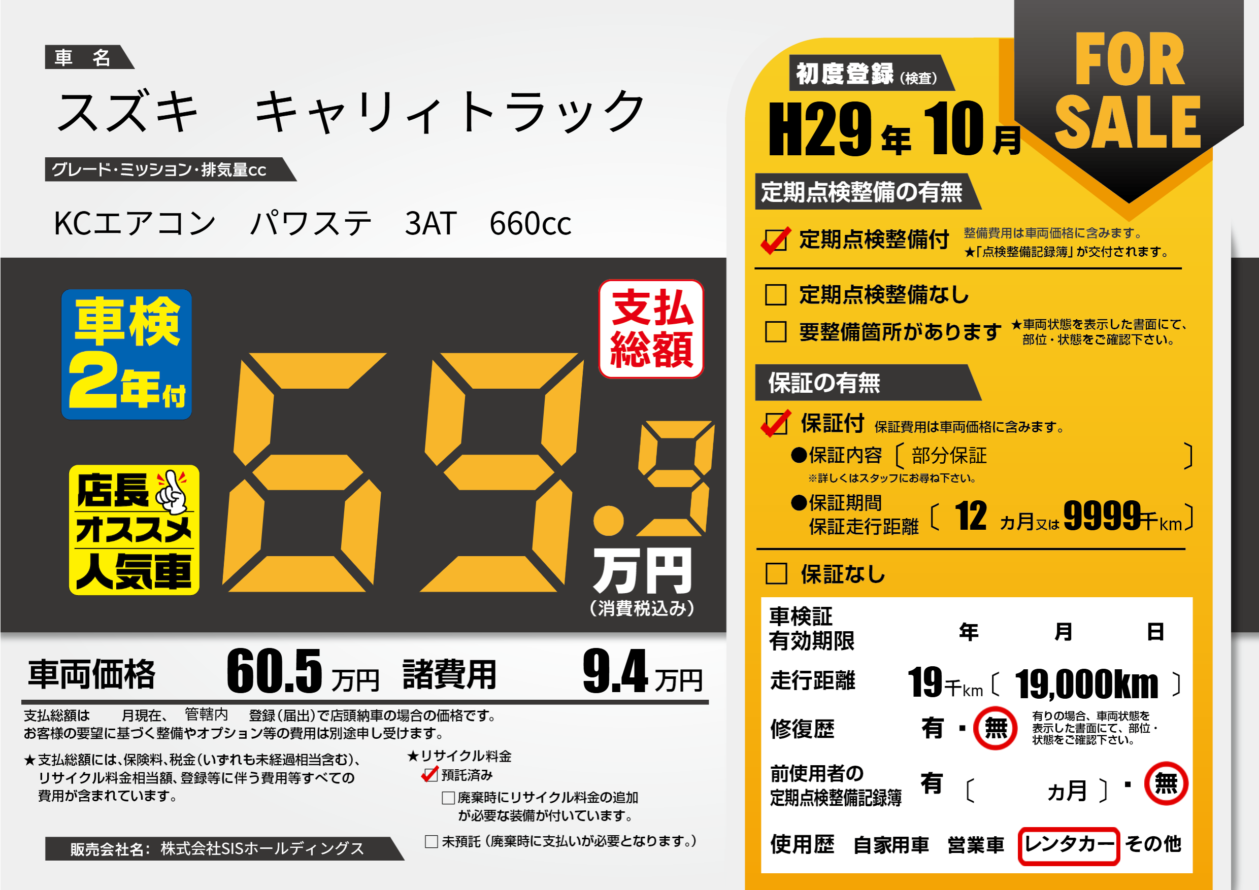 | 走行キロ | 1.9万km | 初年度登録 | H29年10月 |
