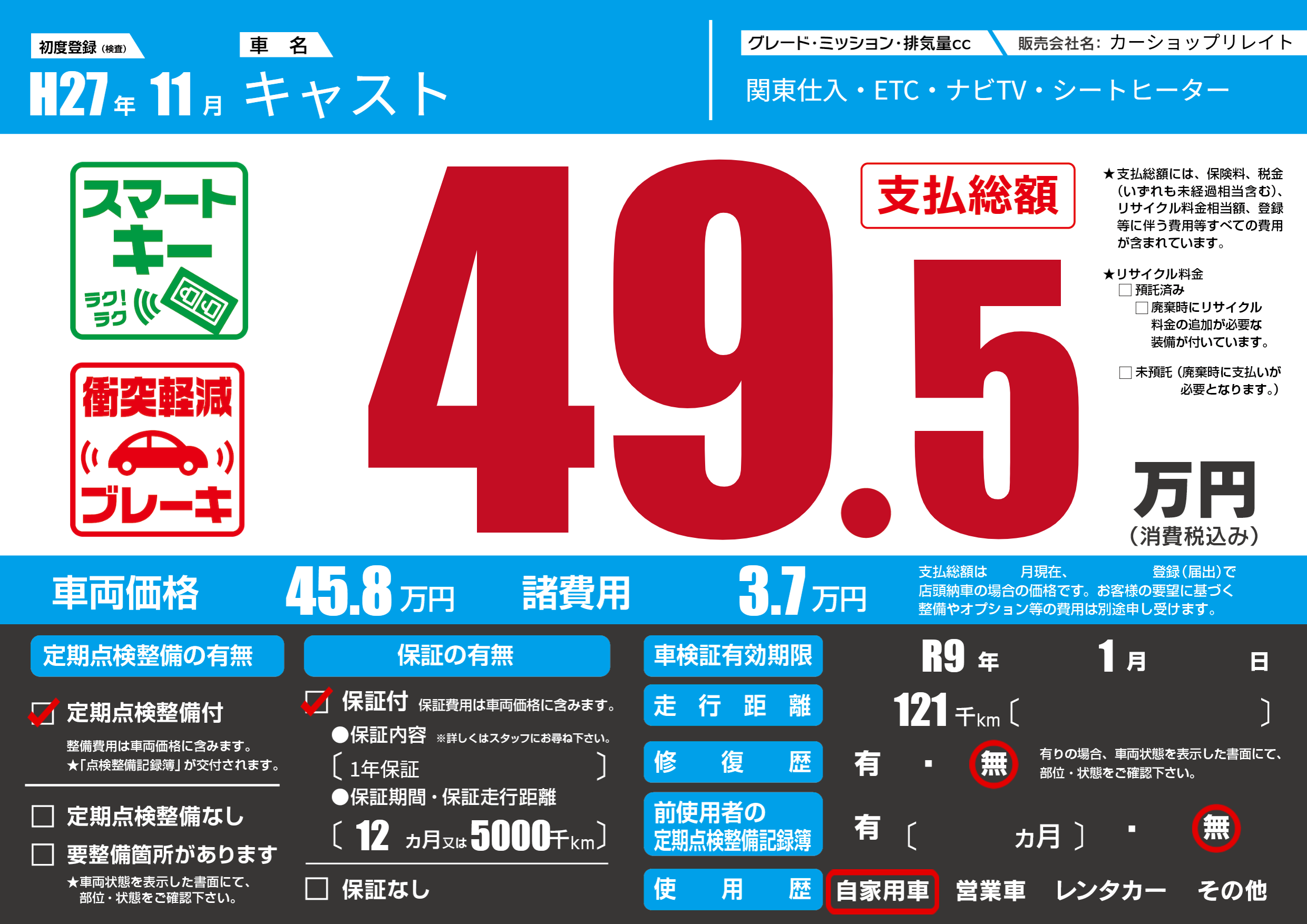 | 車検制限 | R9年 1月 - 日 | ||