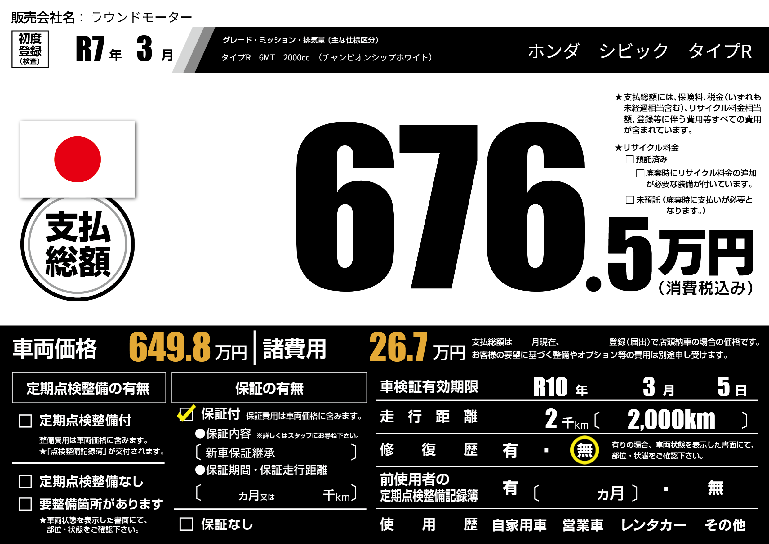 保証付き 保証内容(新車保証継承) ---ヶ月または()千kmまで |