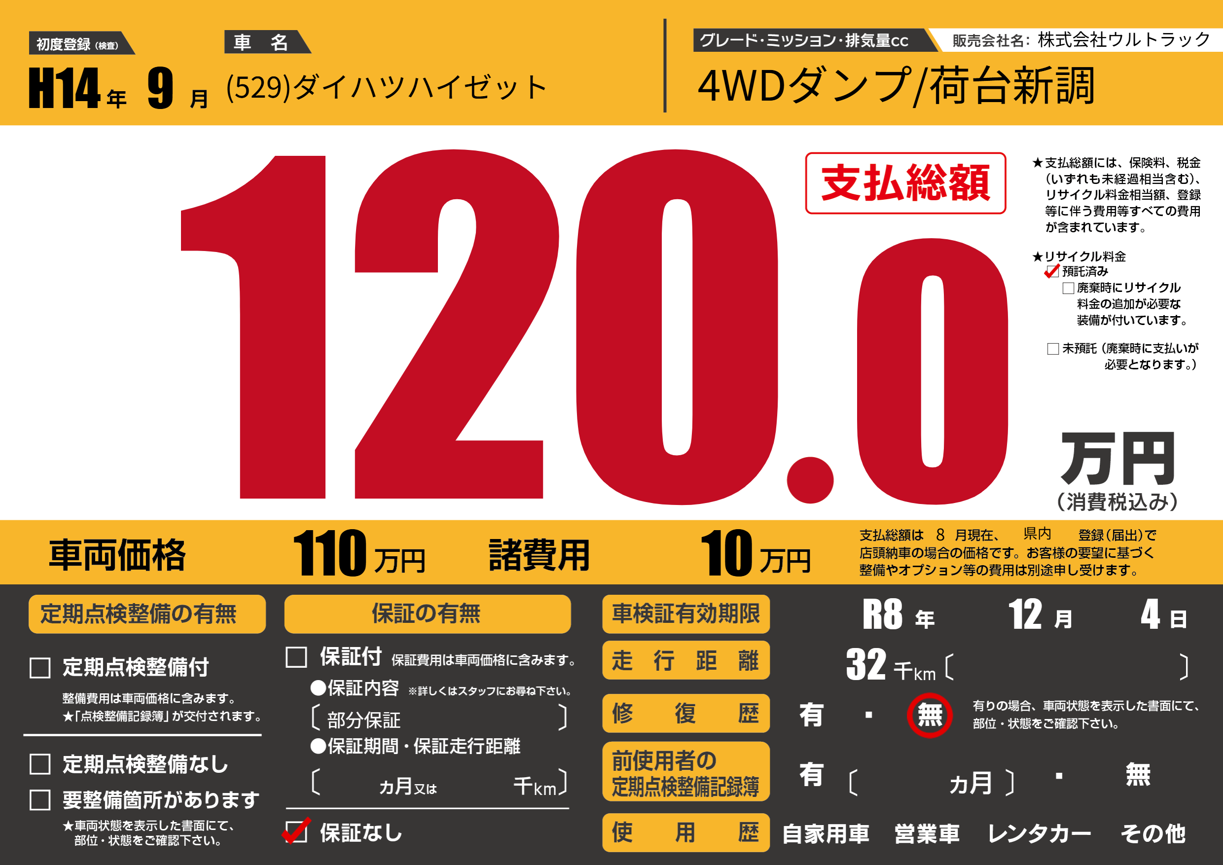 保証なし 保証内容(部分保証) ---ヶ月または()千kmまで |