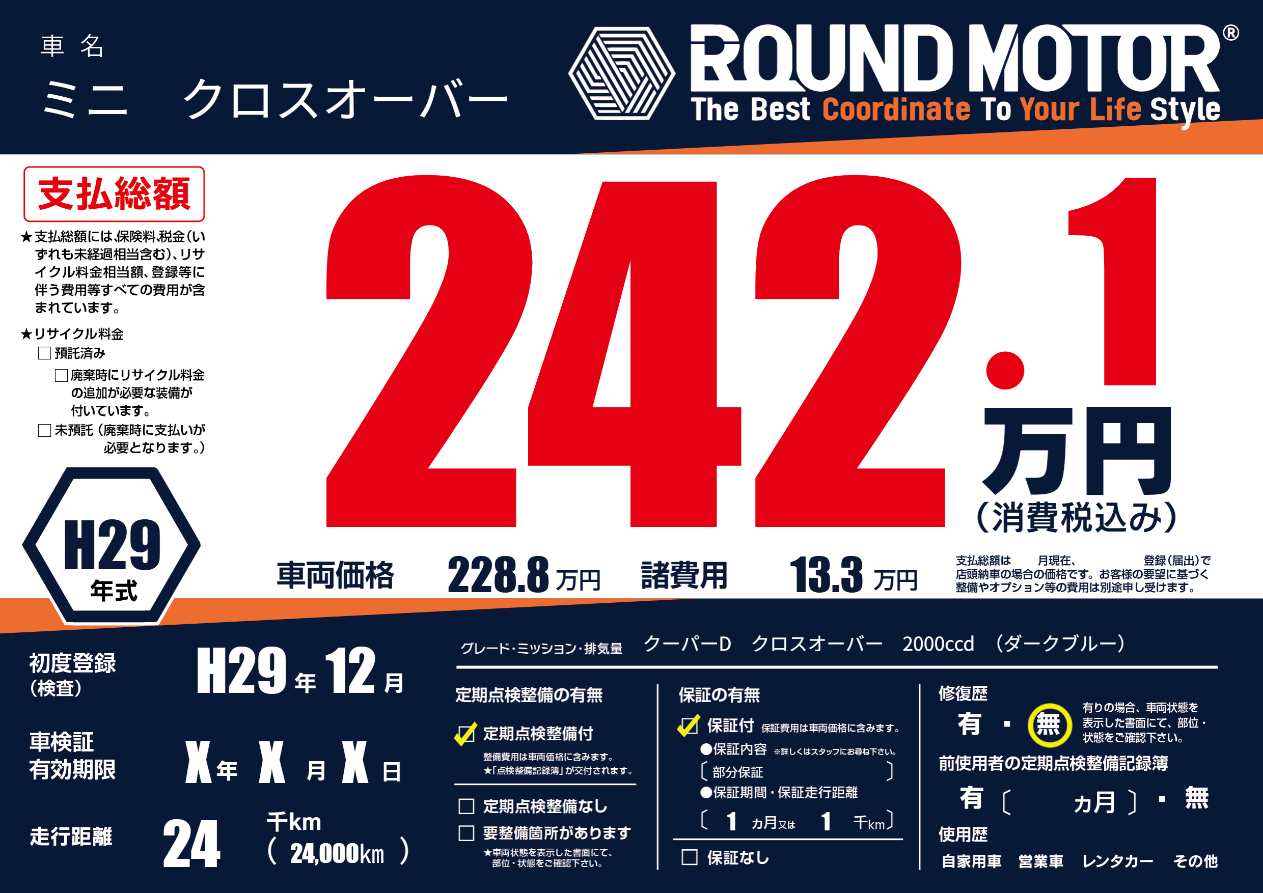 | 走行キロ | 2.4万km | 初年度登録 | H29年12月 |
