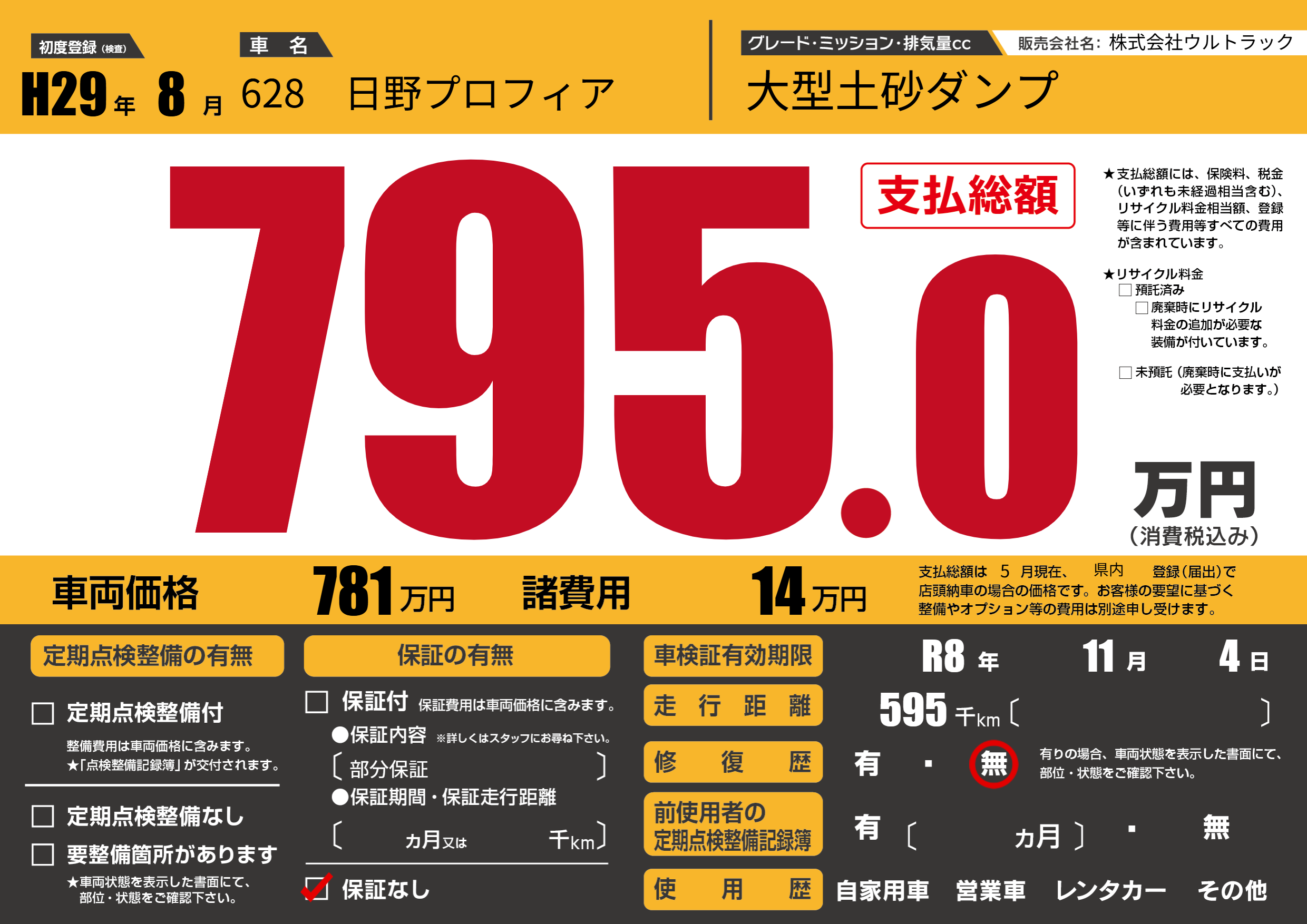| 走行キロ | 59.5万km | 初年度登録 | H29年8月 |