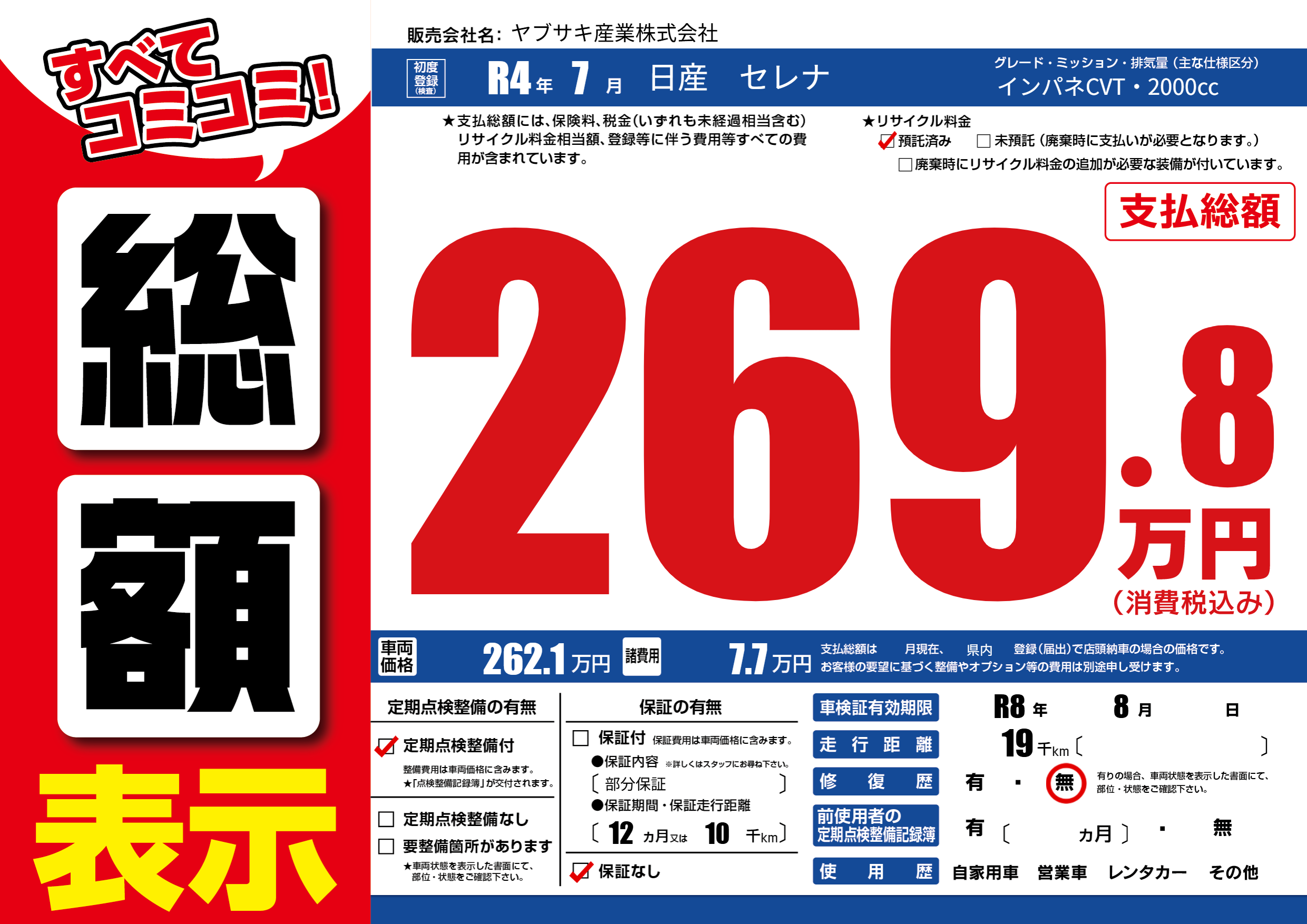 | 車名 | 日産 セレナ | グレード ミッション 排気量 |