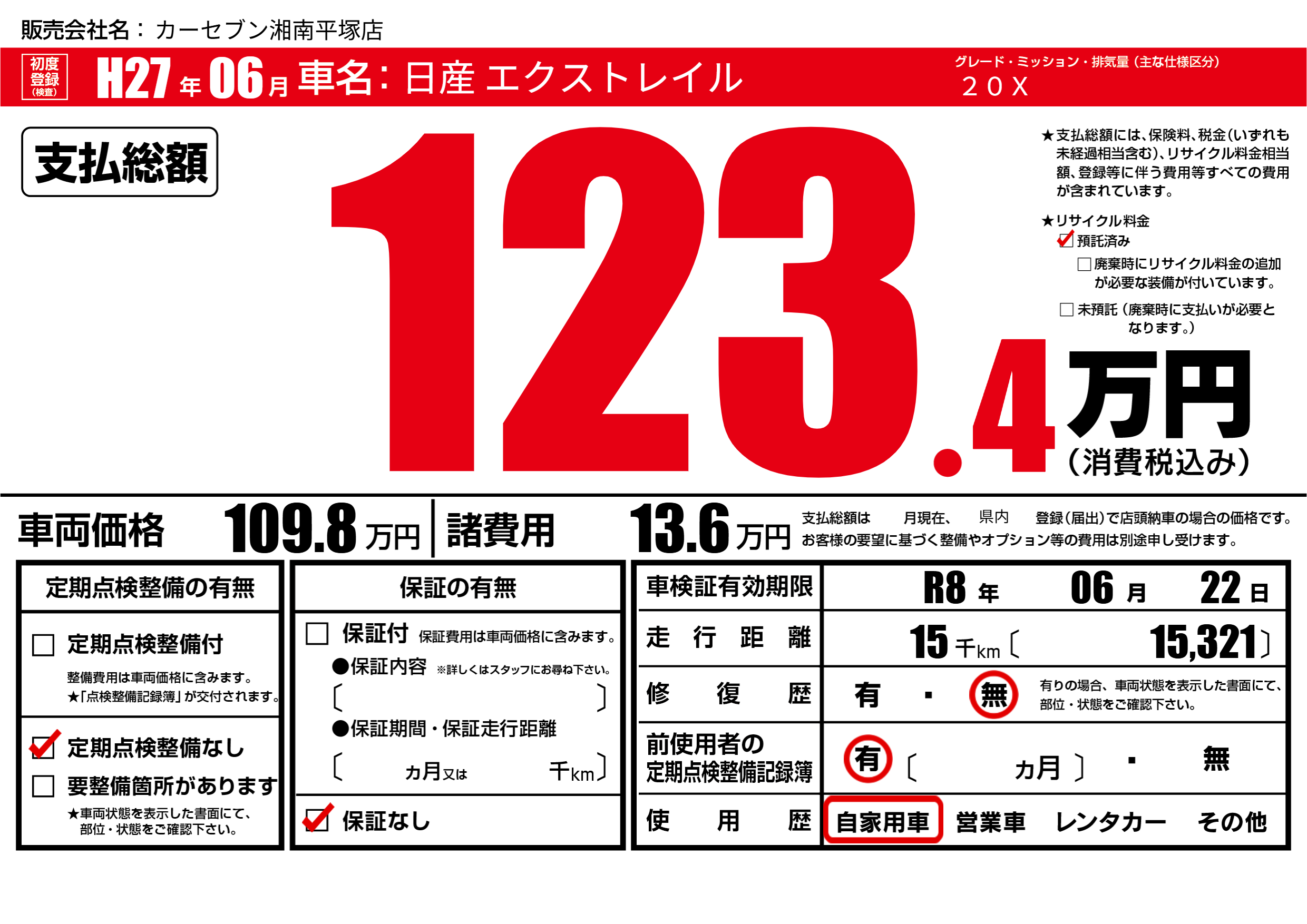 | 走行キロ | 1.5万km | 初年度登録 | H27年06月 |