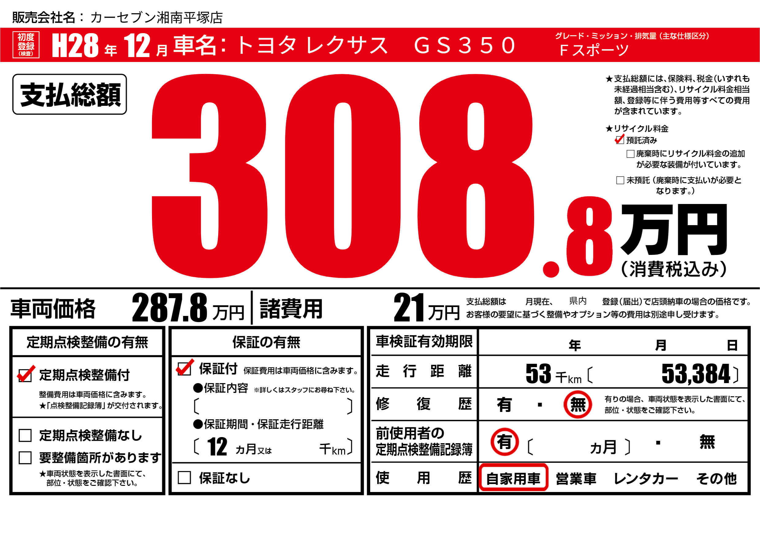 | 車名 | トヨタ レクサス GS350 | グレード ミッション 排気量 |