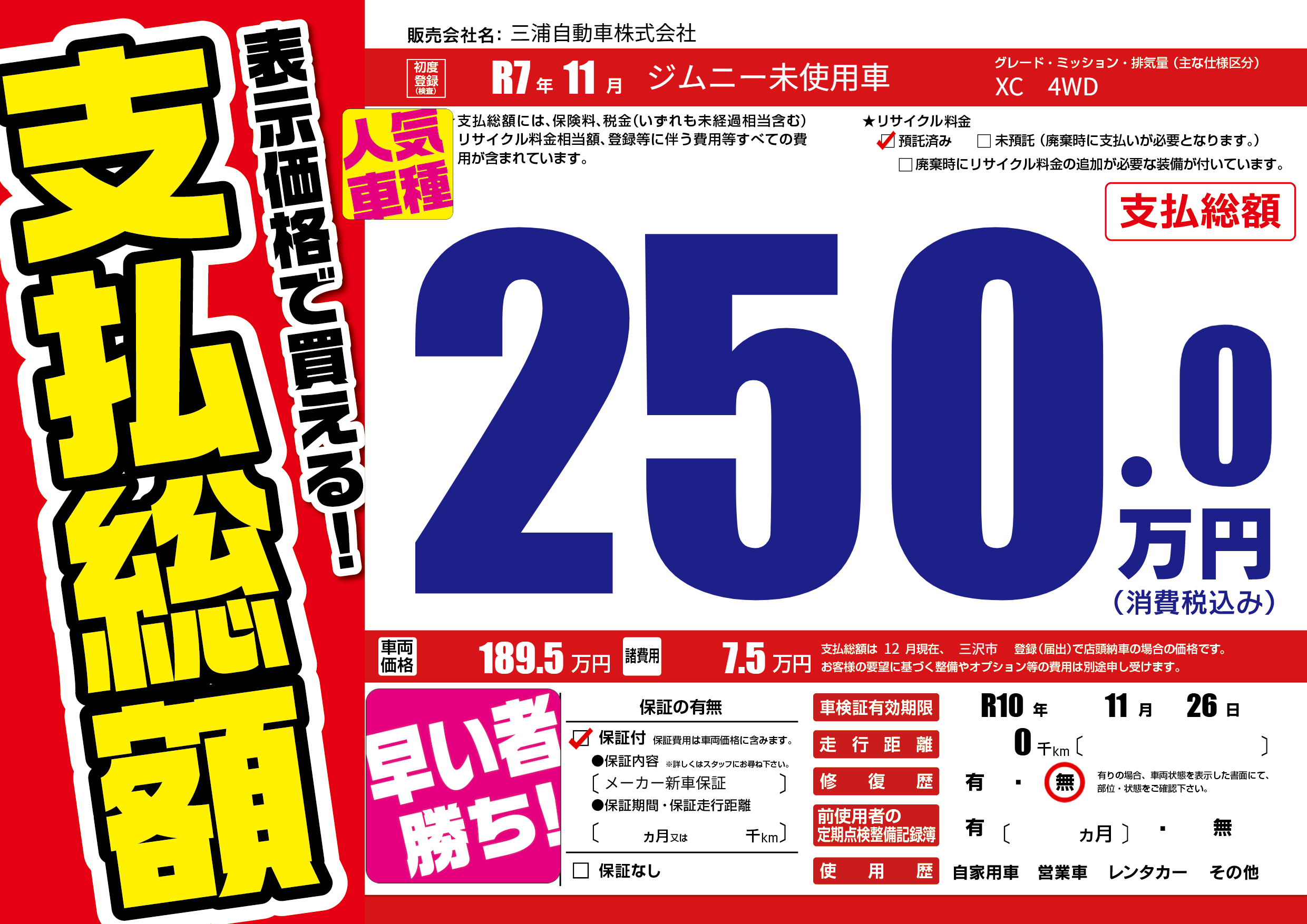 | 車名 | ジムニー未使用車 | グレード ミッション 排気量 |