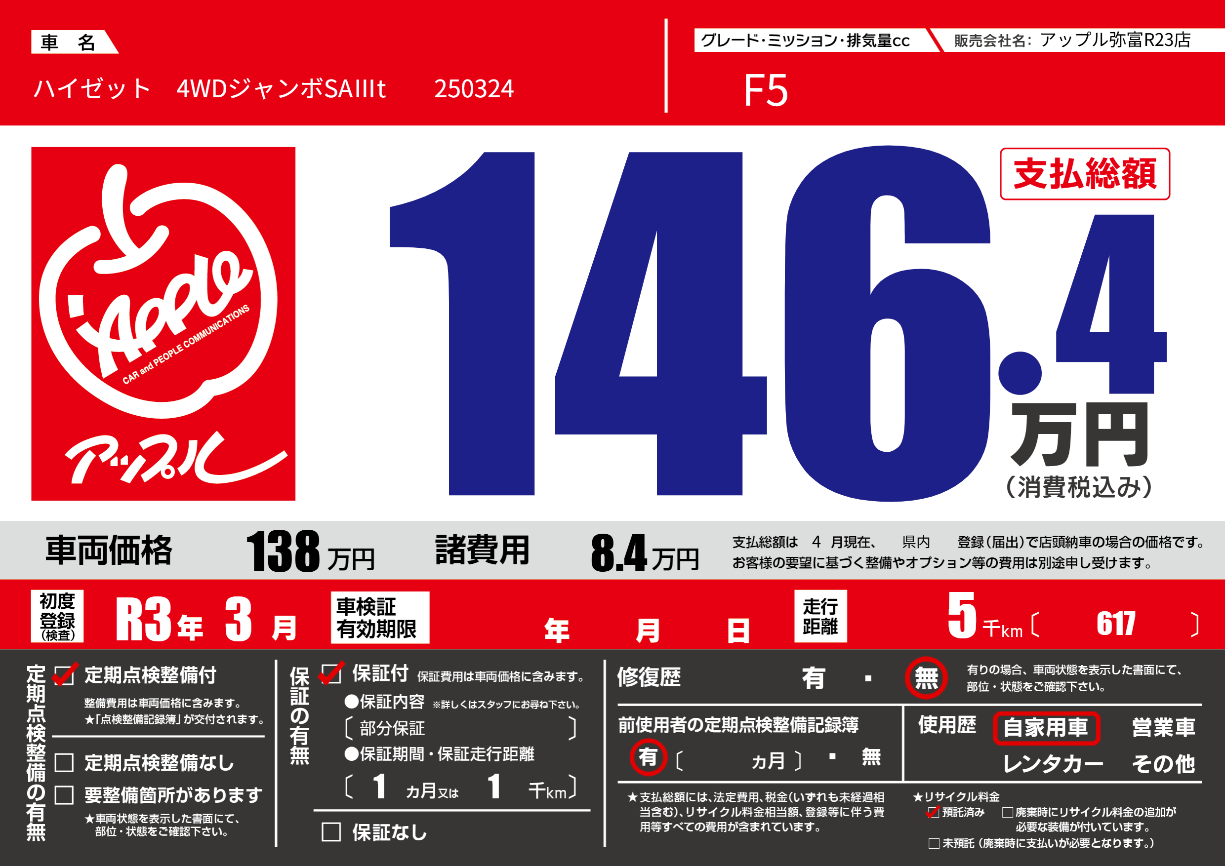 | 車名 | ハイゼット 4WDジャンボSAⅢt 250324 | グレード ミッション 排気量 |
