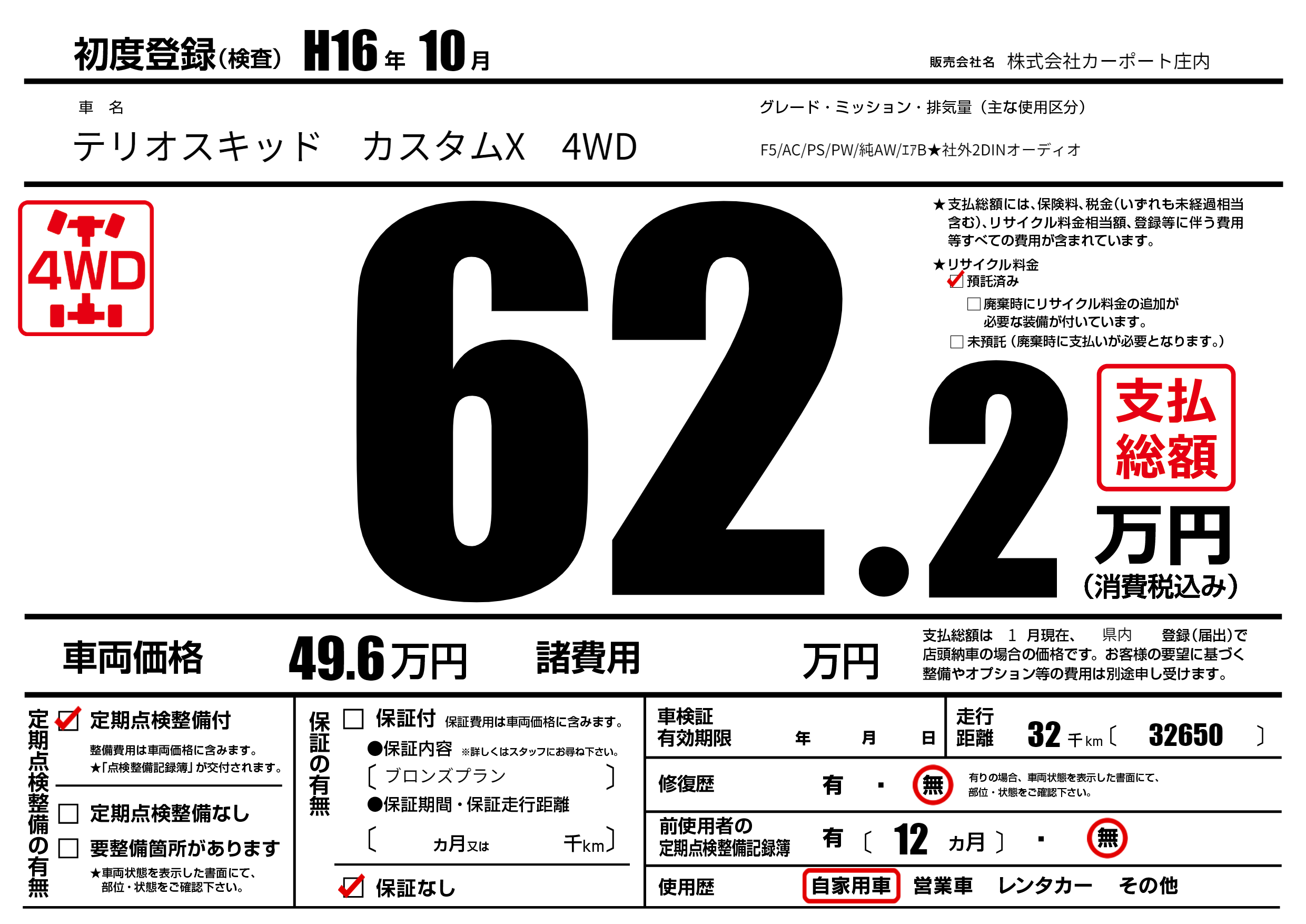 | 車名 | テリオスキッド カスタムX 4WD | グレード ミッション 排気量 |