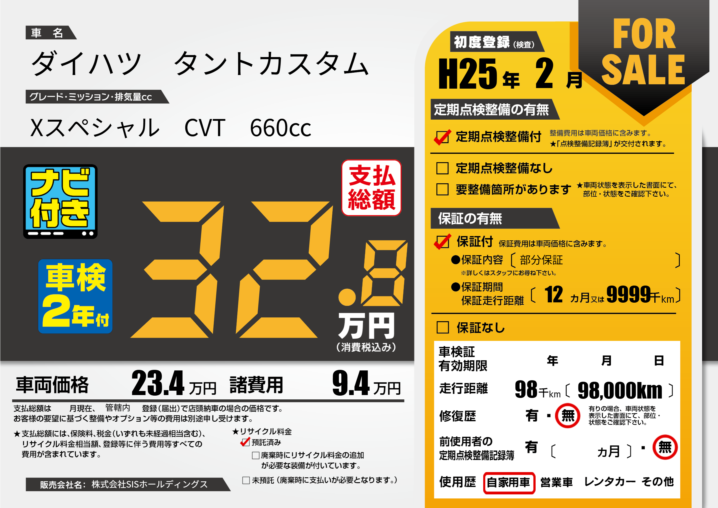 | 走行キロ | 9.8万km | 初年度登録 | H25年2月 |