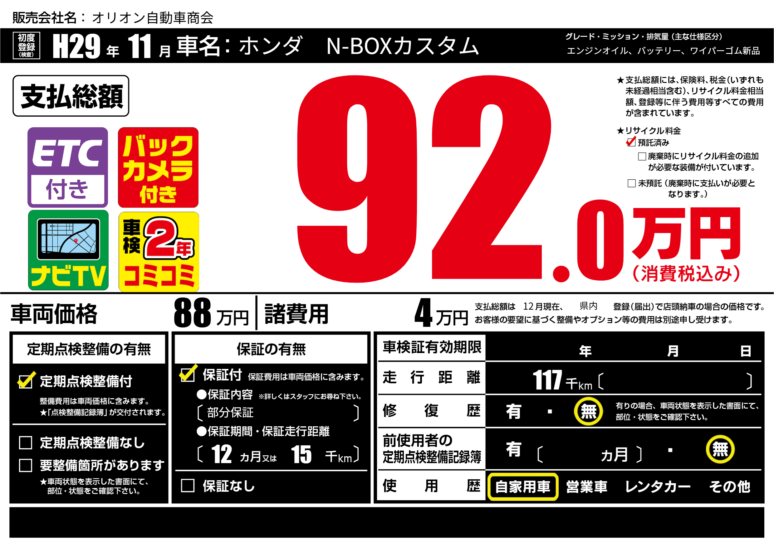 | 車名 | ホンダ N-BOXカスタム | グレード ミッション 排気量 |