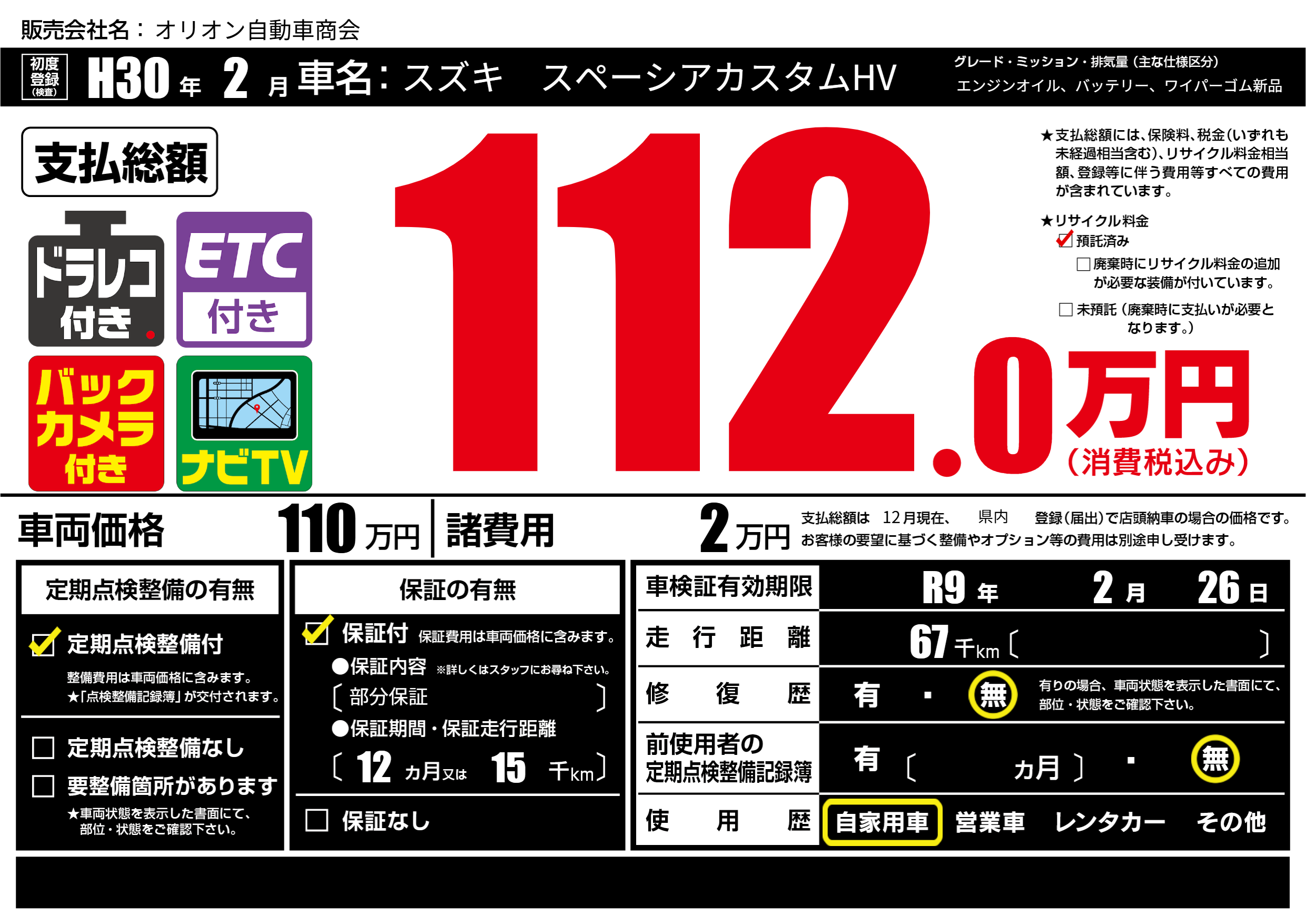| 走行キロ | 6.7万km | 初年度登録 | H30年2月 |