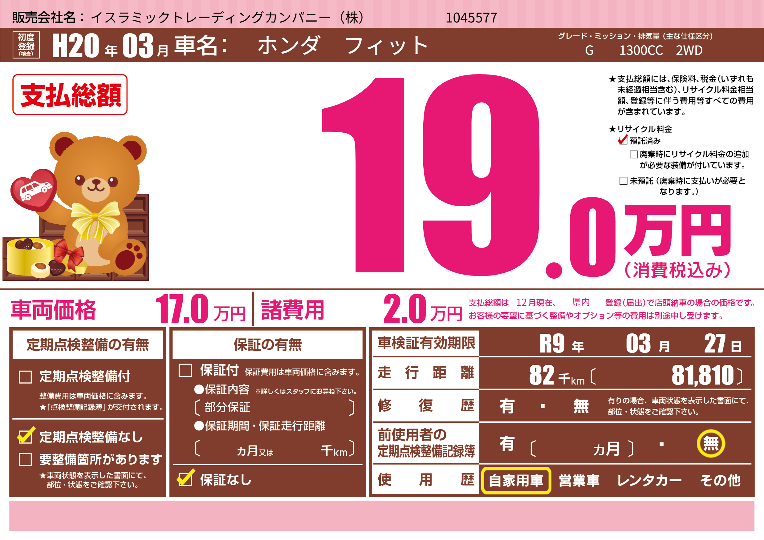 保証なし 保証内容(部分保証) ---ヶ月または()千kmまで |