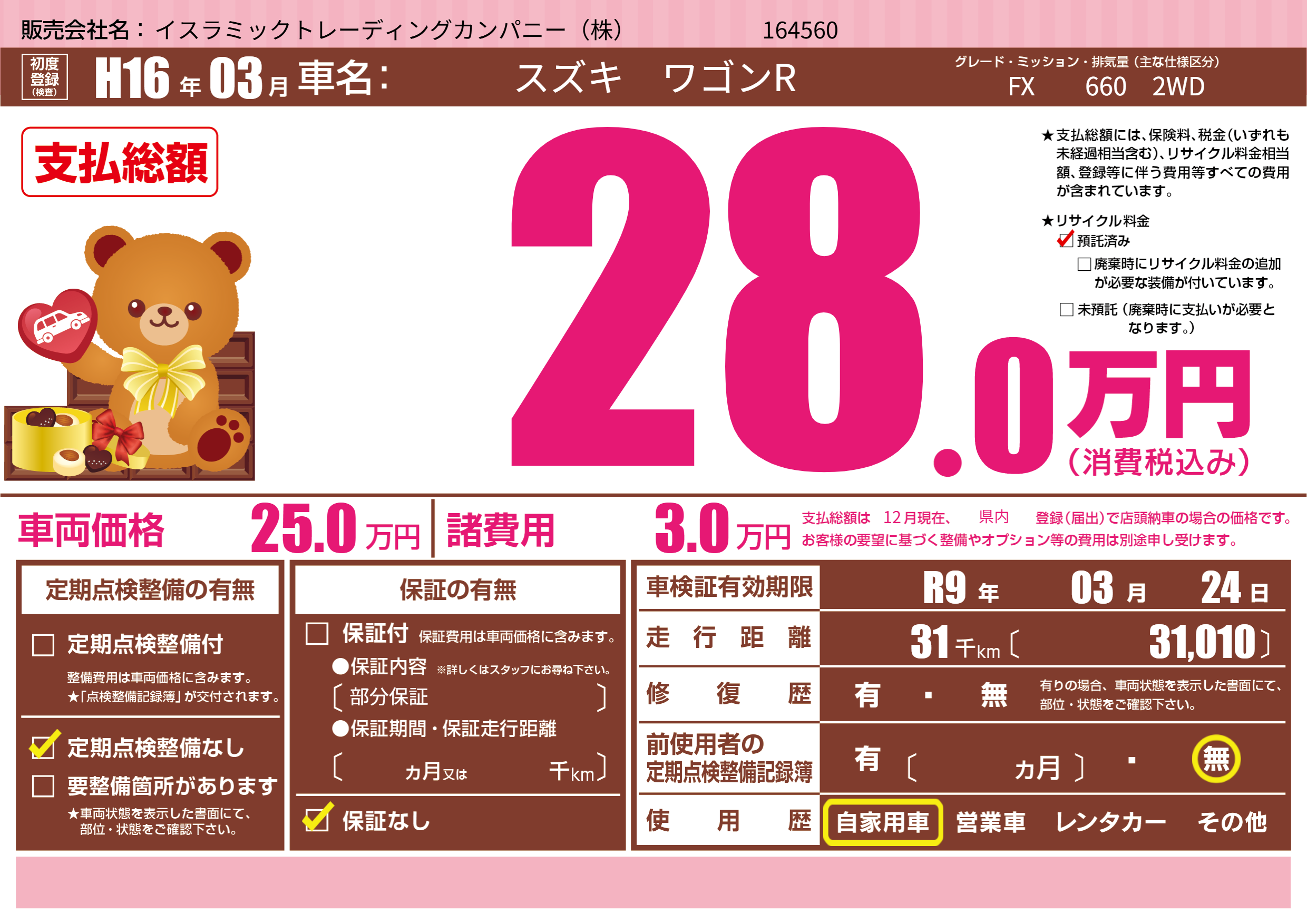 | 走行キロ | 3.1万km | 初年度登録 | H16年03月 |