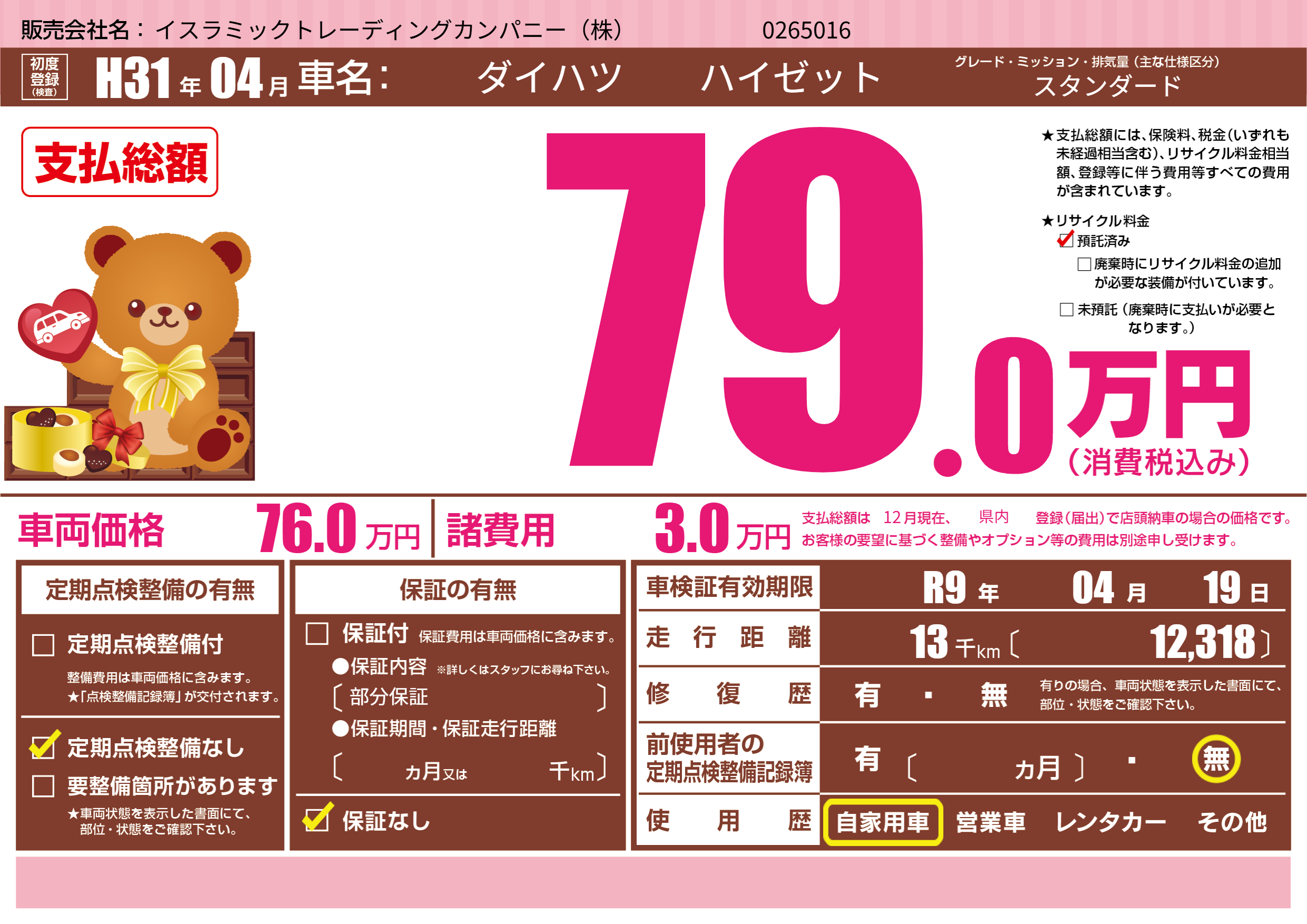 | 走行キロ | 1.3万km | 初年度登録 | H31年04月 |