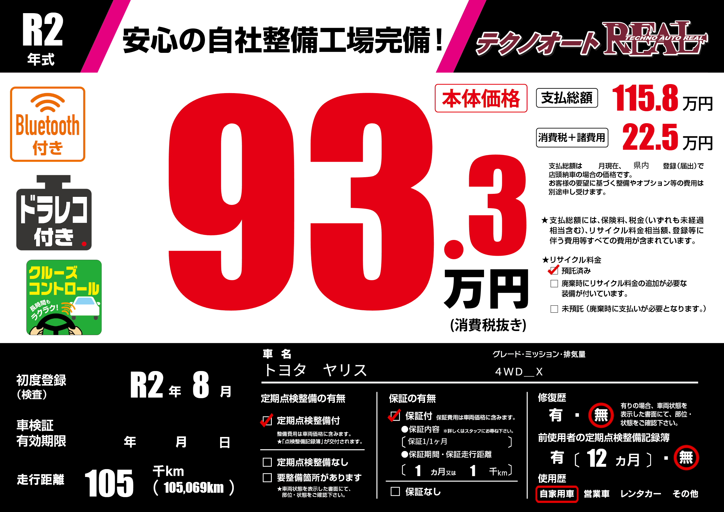 | 走行キロ | 10.5万km | 初年度登録 | R2年8月 |