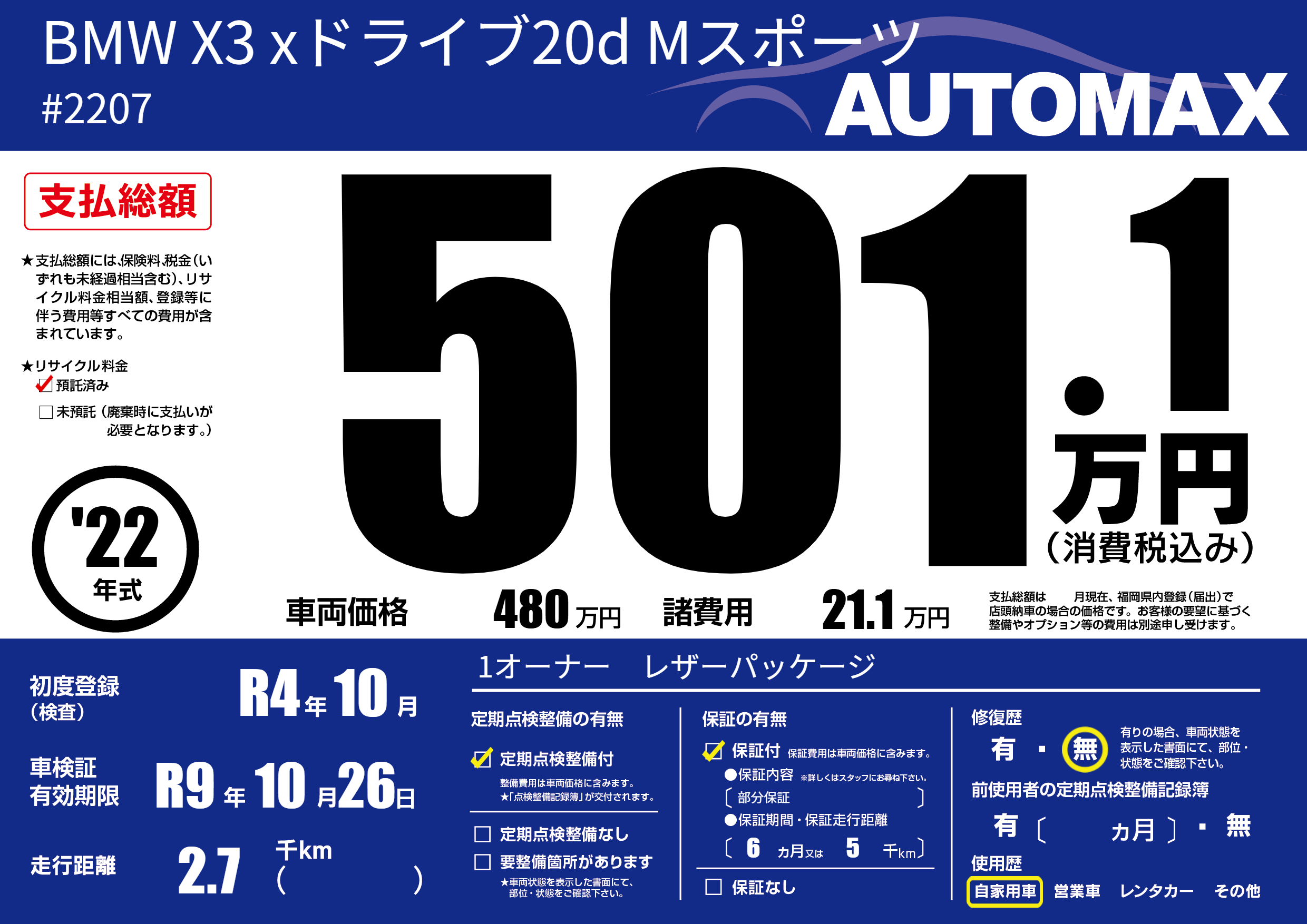 | 車名 | BMW X3 xドライブ20d Mスポーツ | グレード ミッション 排気量 |