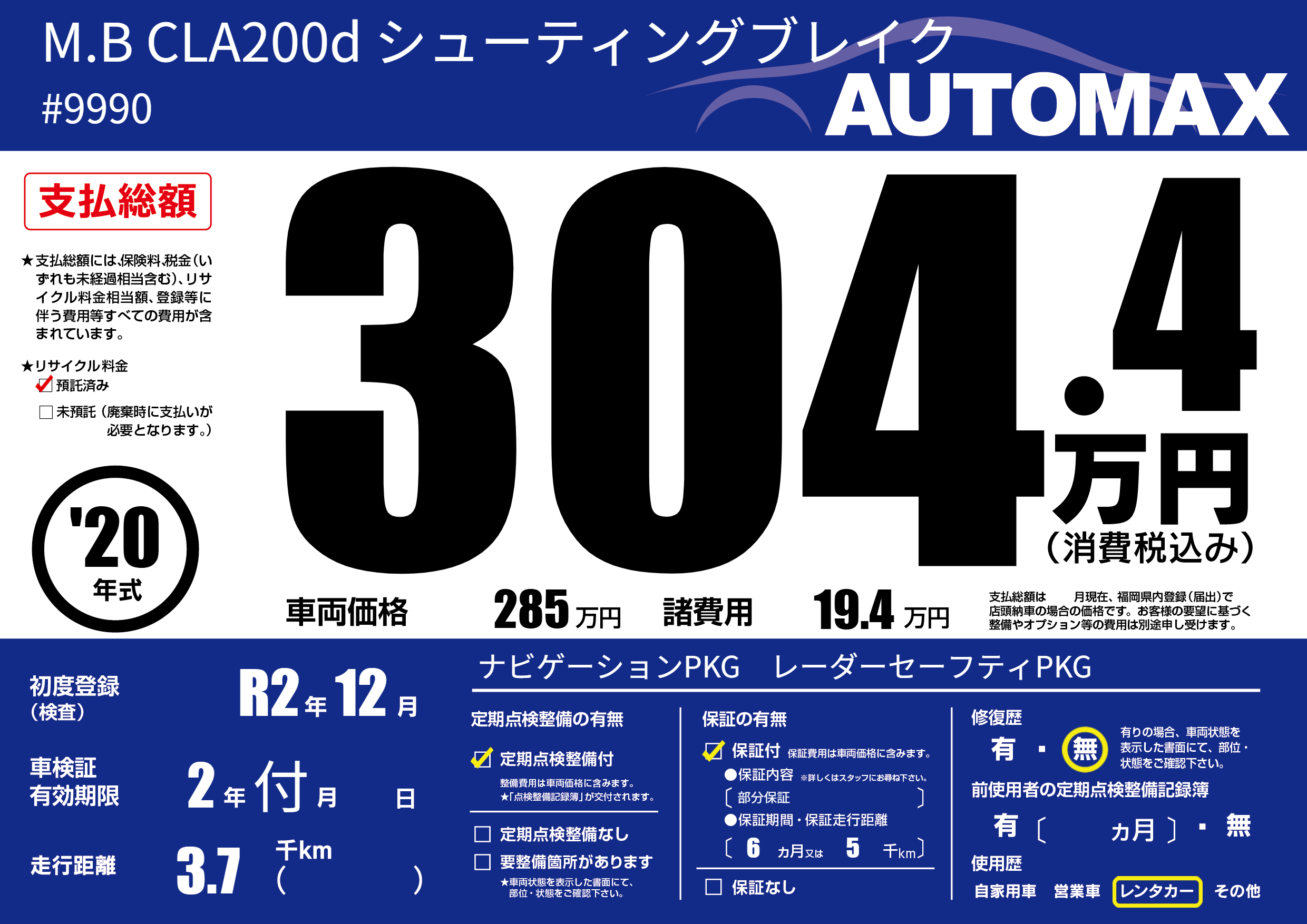 | 車名 | M.B CLA200d シューティングブレイク | グレード ミッション 排気量 |
