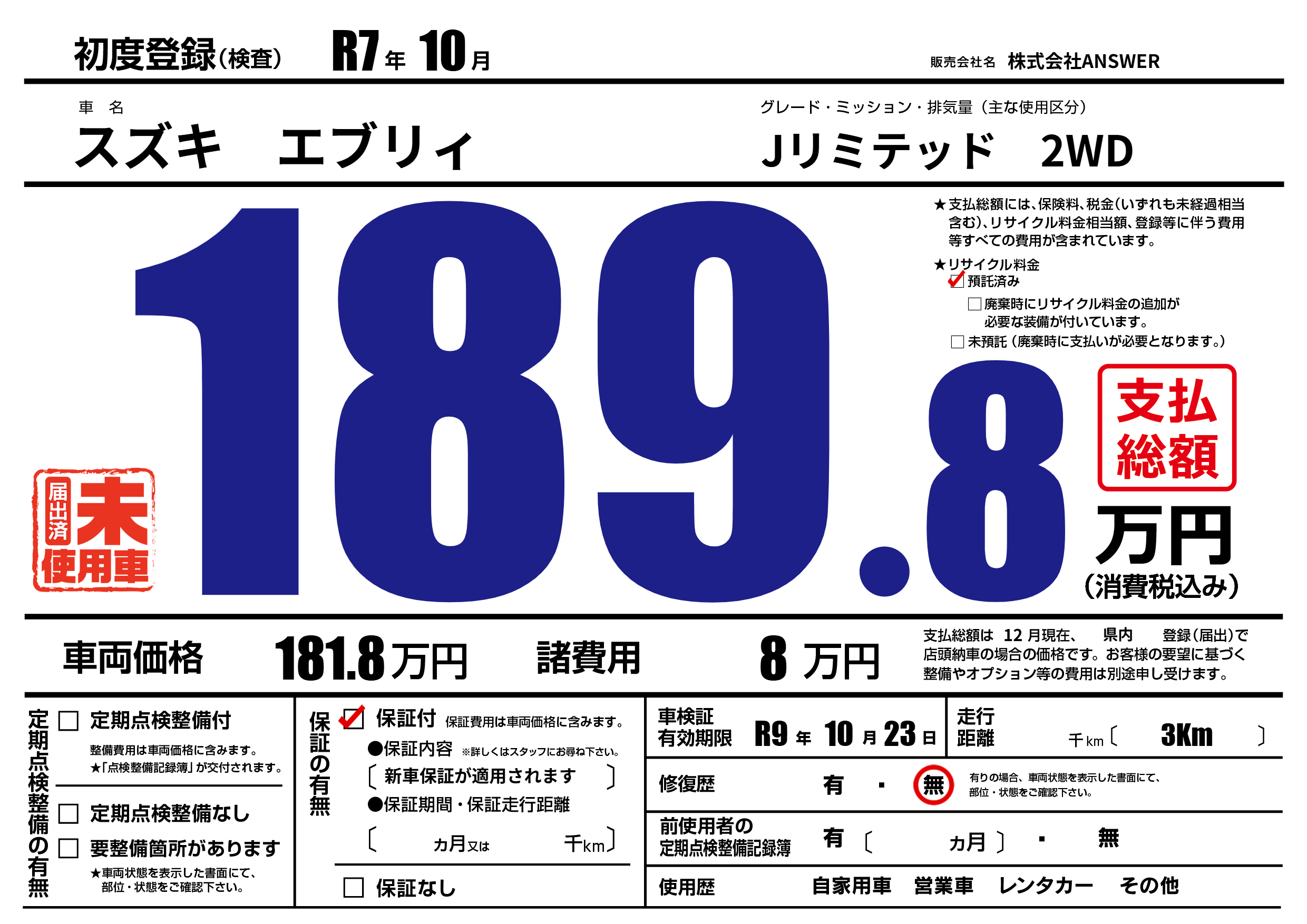 保証付き 保証内容(新車保証が適用されます) ---ヶ月または()千kmまで |